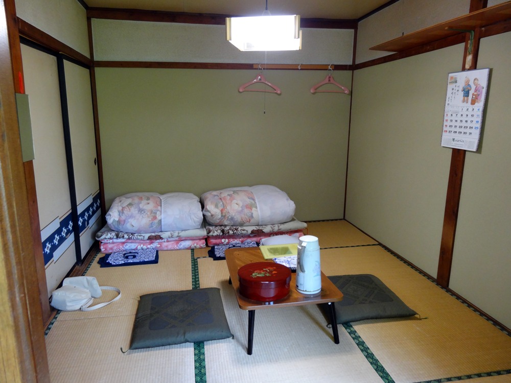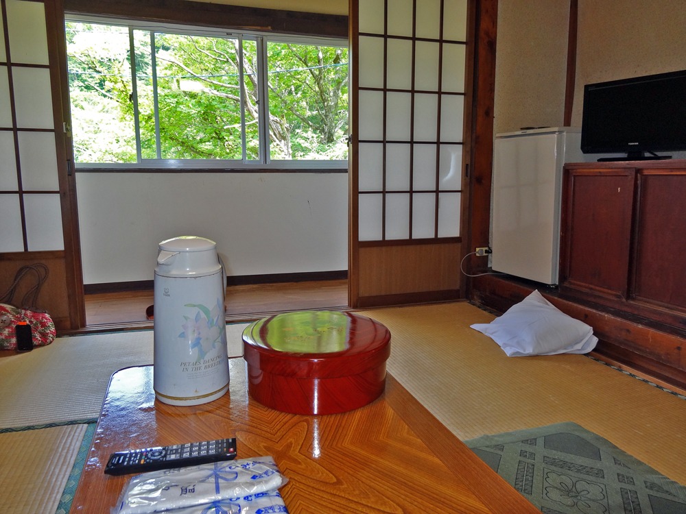 築85年以上というこの昭和館は、非常にシンプル。お部屋もこんな感じでTVがデジタル対応になってる以外には、昔ながらの湯治宿そのものといった感じで、布団も自分で好きな時に好きなように敷いてという気楽さ。