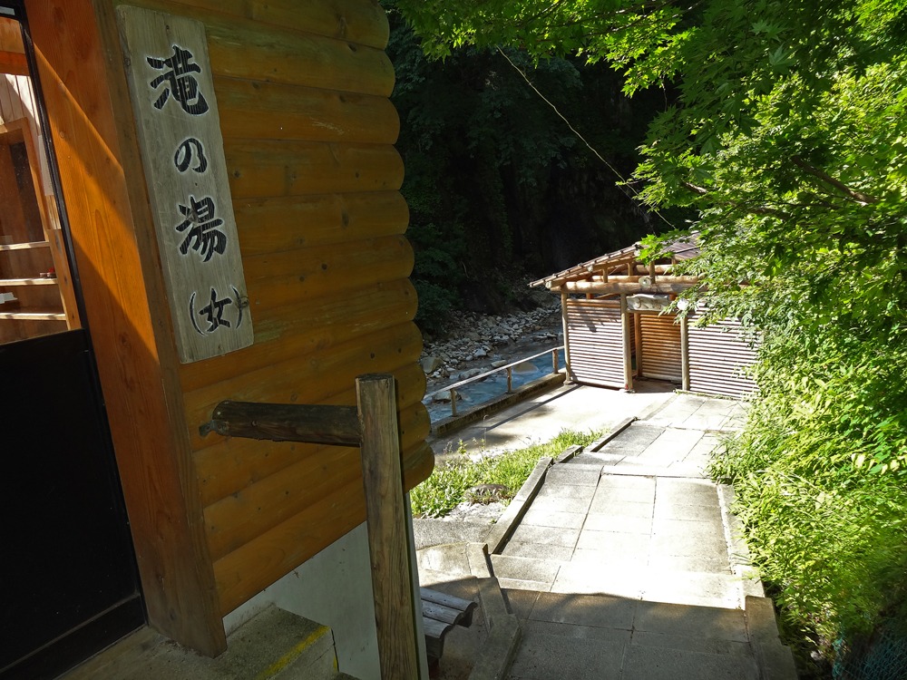 露天といっても壁に囲まれ屋根もあり、内湯っぽい感じ。(女性専用になってからの仕様かな?)大きな窓があって、渓流を見下ろすと、疝気の湯が丸見えだったりする(笑