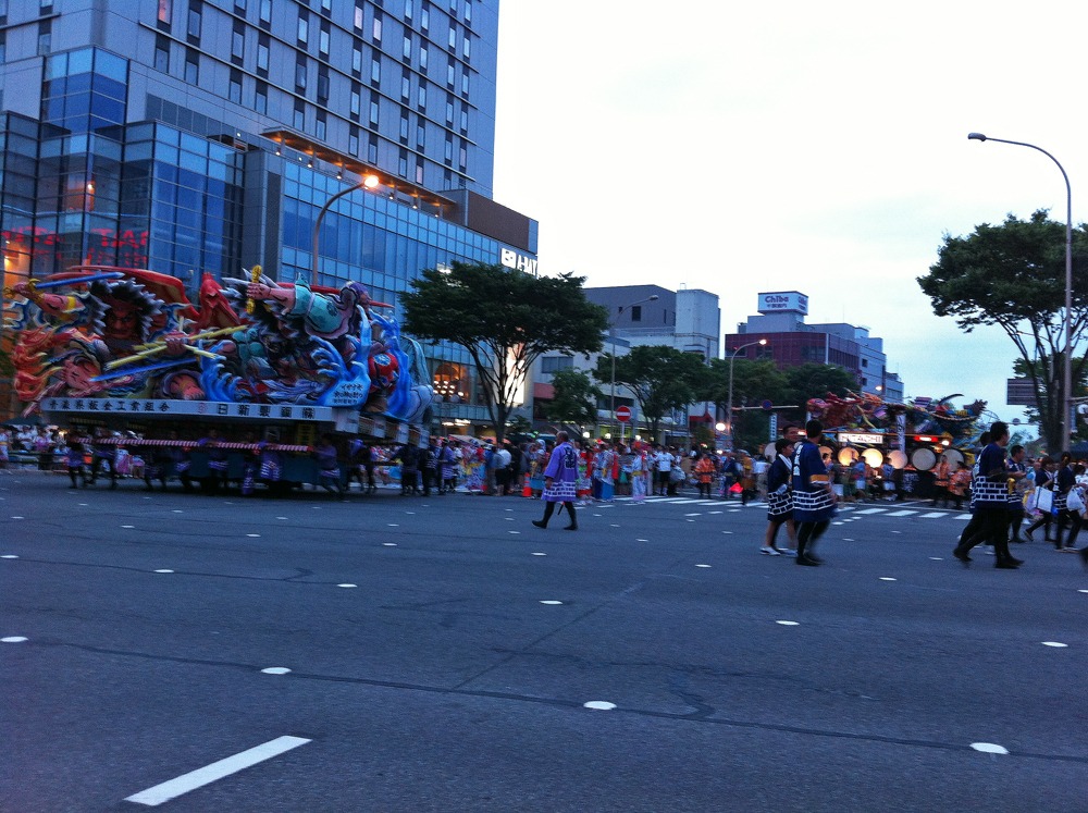 疲れてきたせいか、途中から全然ハネずにずっとだらだら歩いてるだけの人々も結構いたり、最初はかなり息を合わせた感じで「らっせ〜〜ら」とやってたのが、参加したのが系列グループの連合体であることもあってか、途中からかなりバラバラにそれぞれあちこちで音頭をとる人がいてリズムが乱れてどこに合わせたらいいのかわからない混乱に(><)