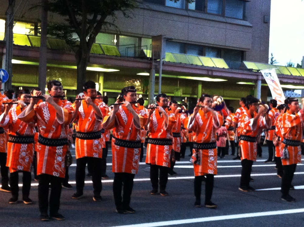 まずは綺麗に並んだお囃子隊の演奏からはじまる。
