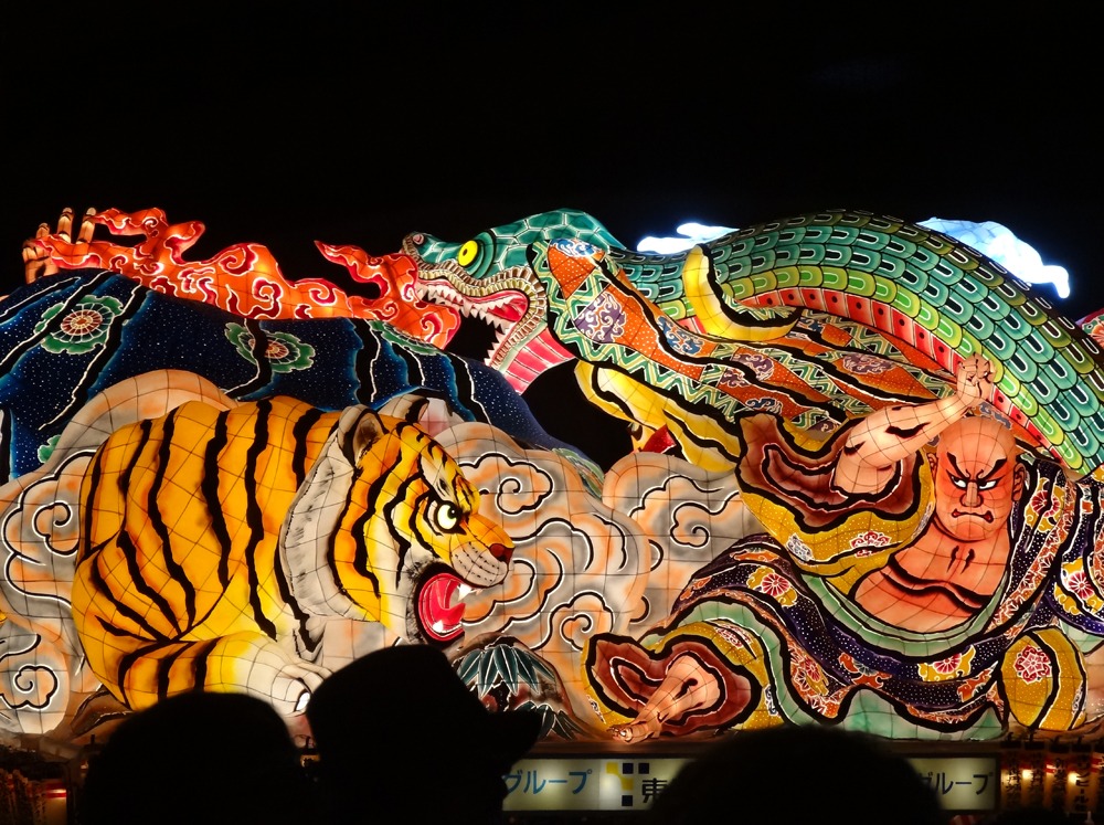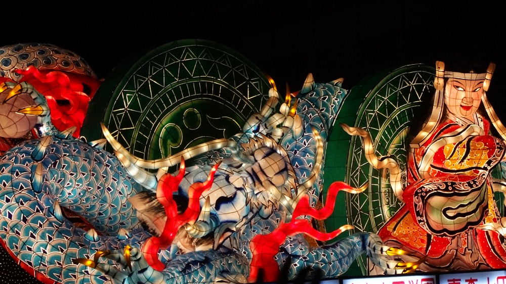 ねぶたにも灯りが入り、日が落ちた空に生き生きとよみがえる。
