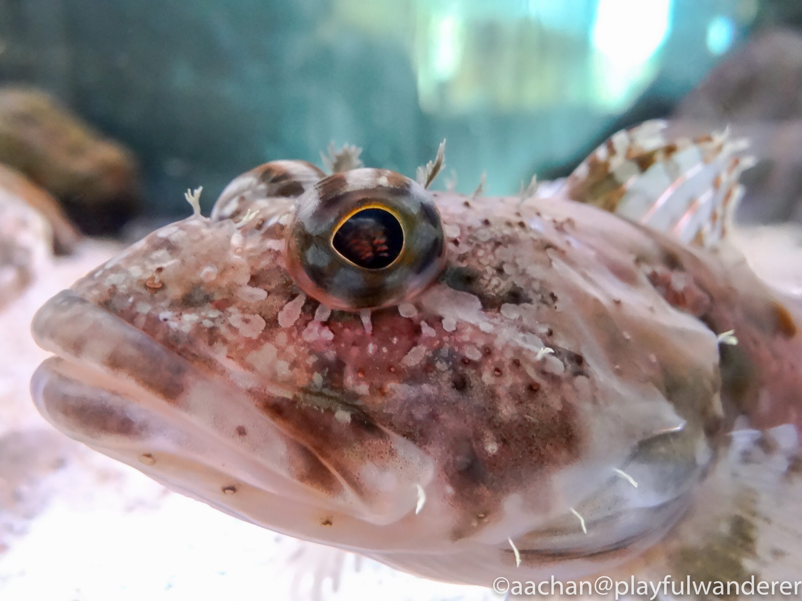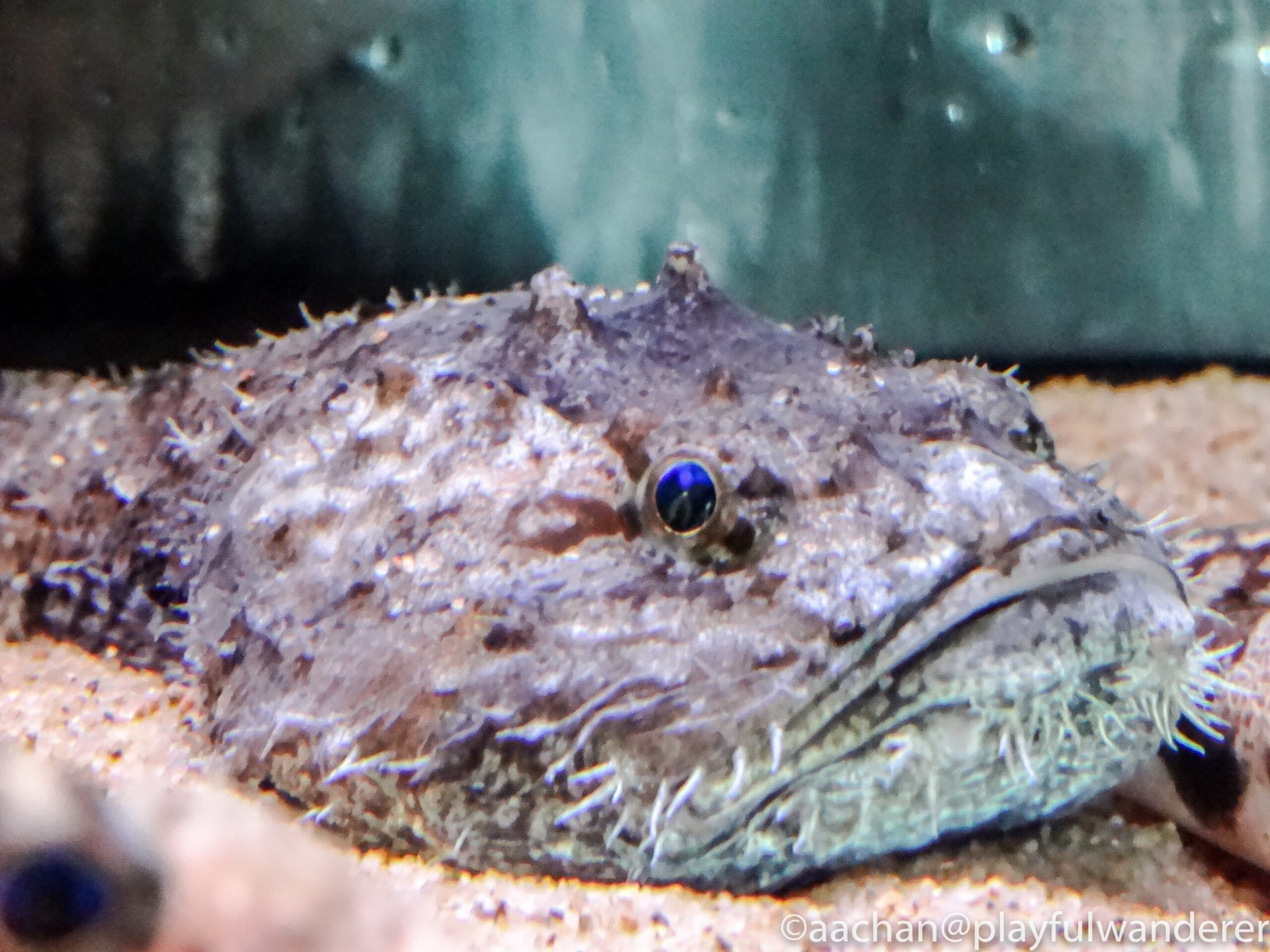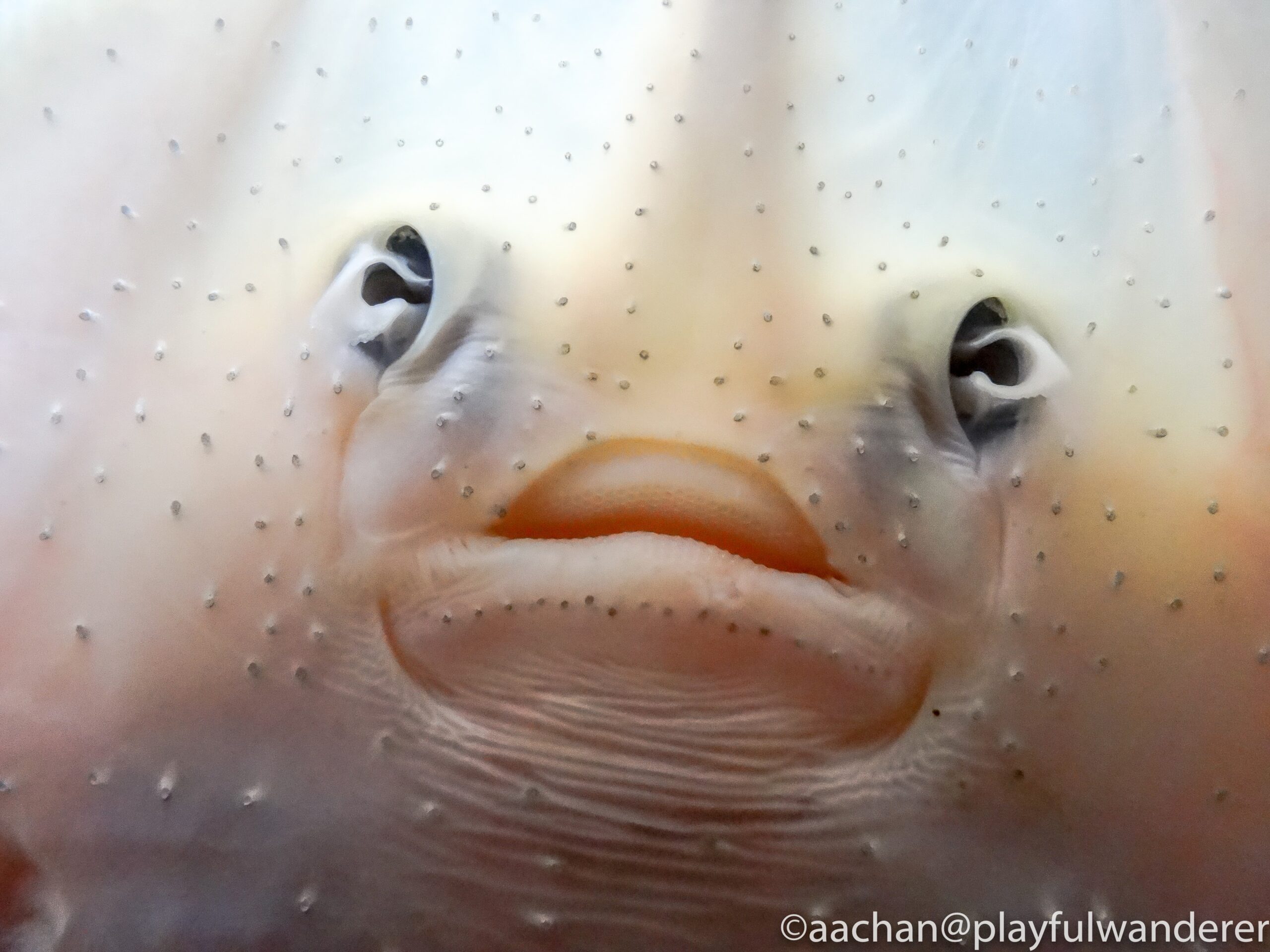 水槽にへばりついていたエイにへばりつく。ほんと人の顔みたいだねぇ。
