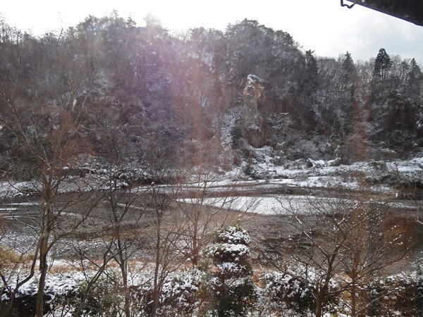 すぐ脇が名取川が見えます。ちょうど正面に大きな岩があり、冬のモノクロームな渋さが情緒を醸し出す。