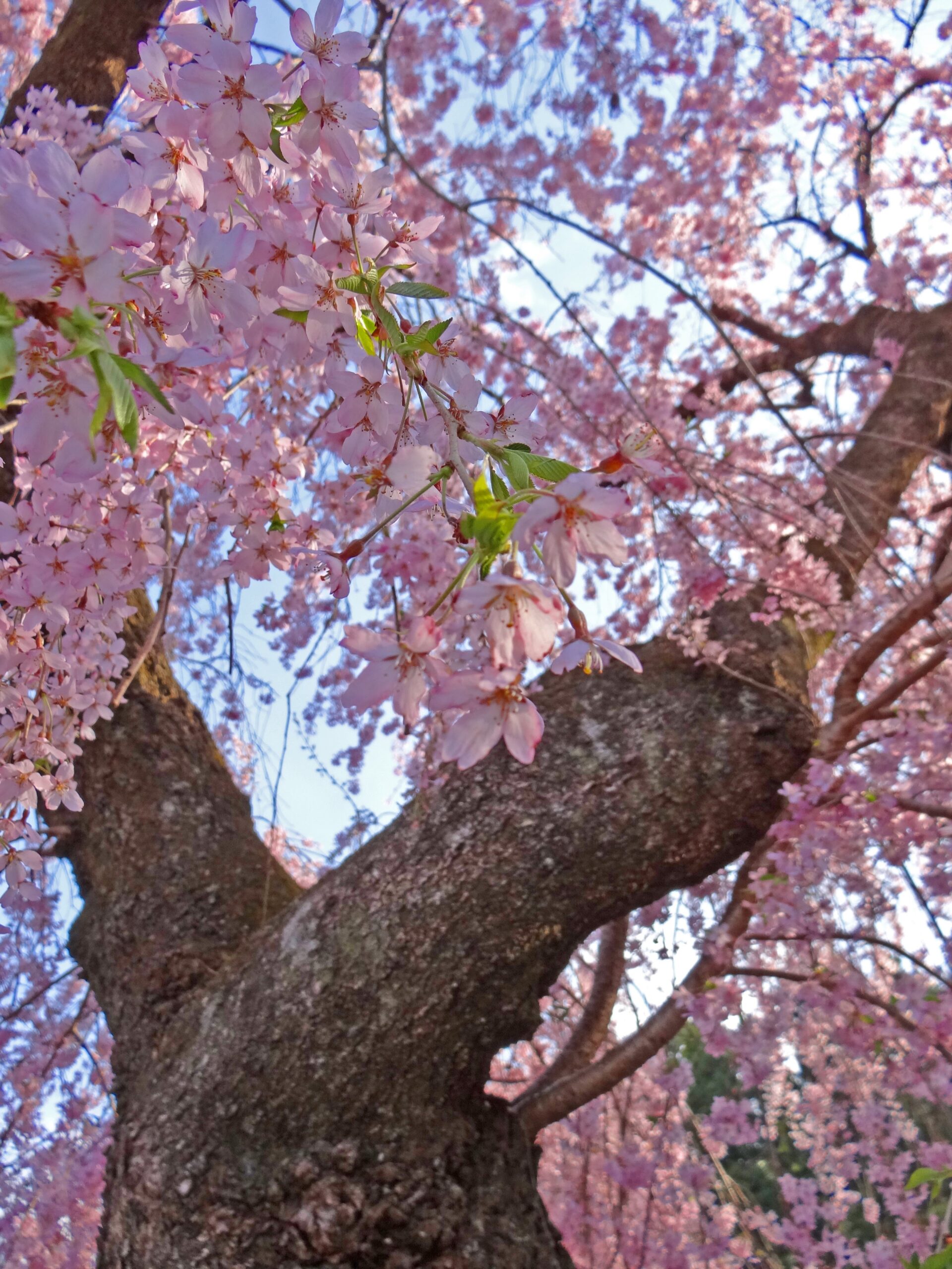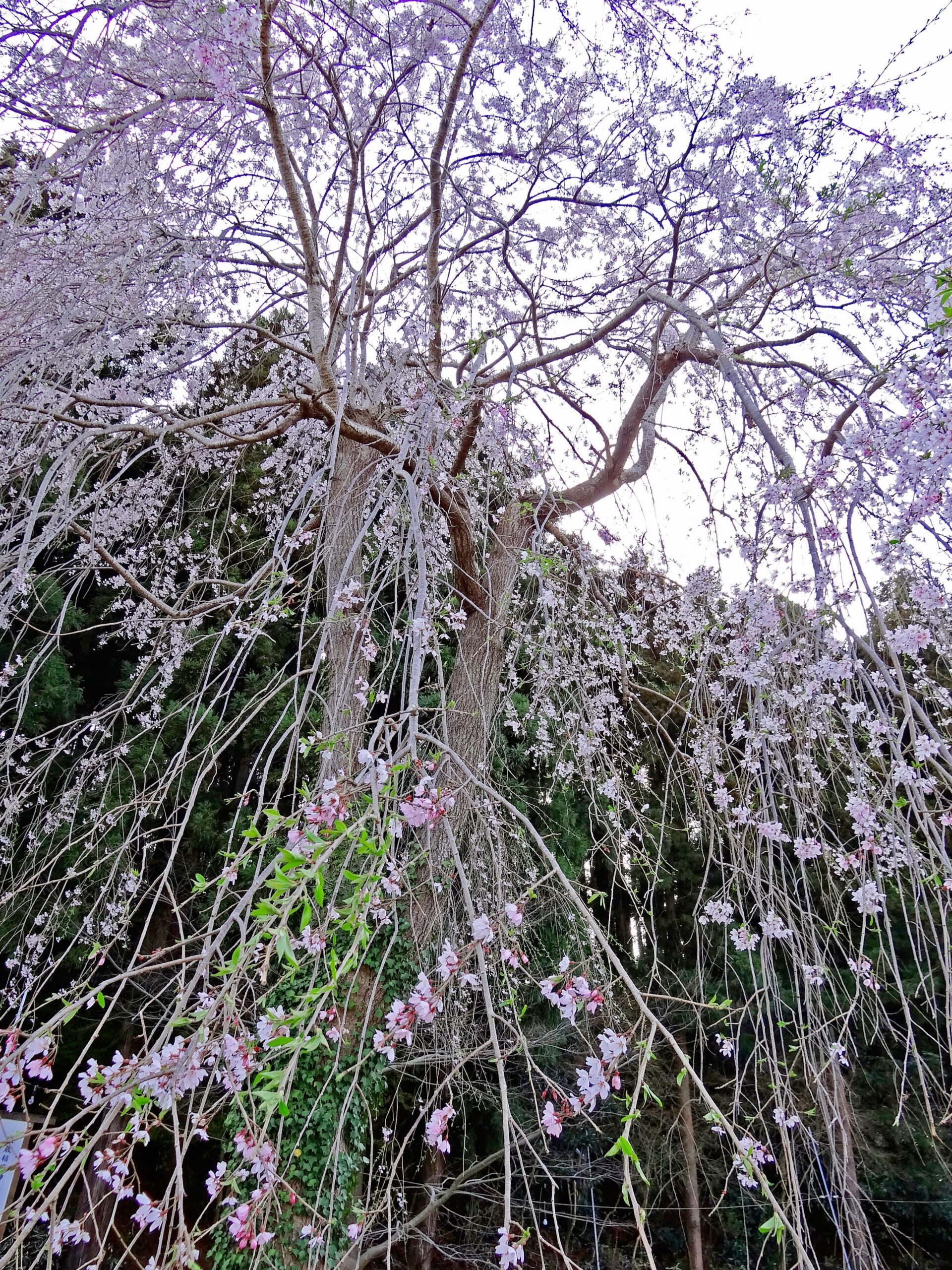 坂を上る手前にも、立派な大きいしだれ桜がそびえています。