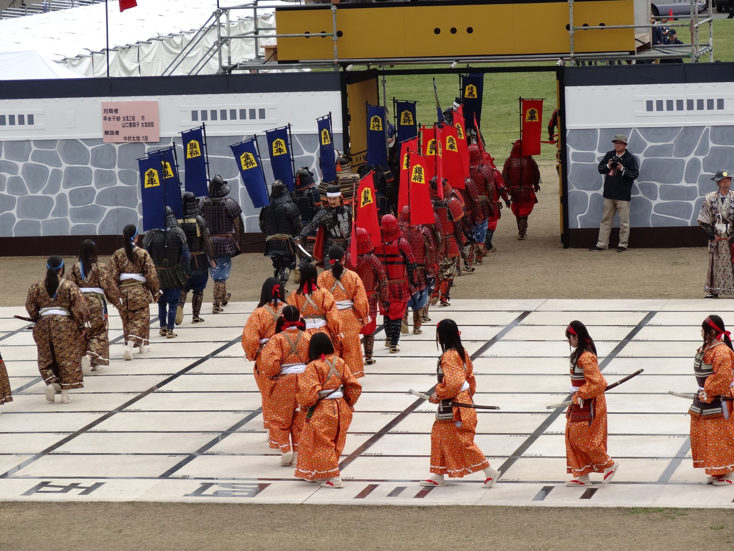青と赤のテーマカラーを持った武将たちの入場。「東軍」「西軍」と名づけられています。(時代が入り混じってるが、関が原かっw)