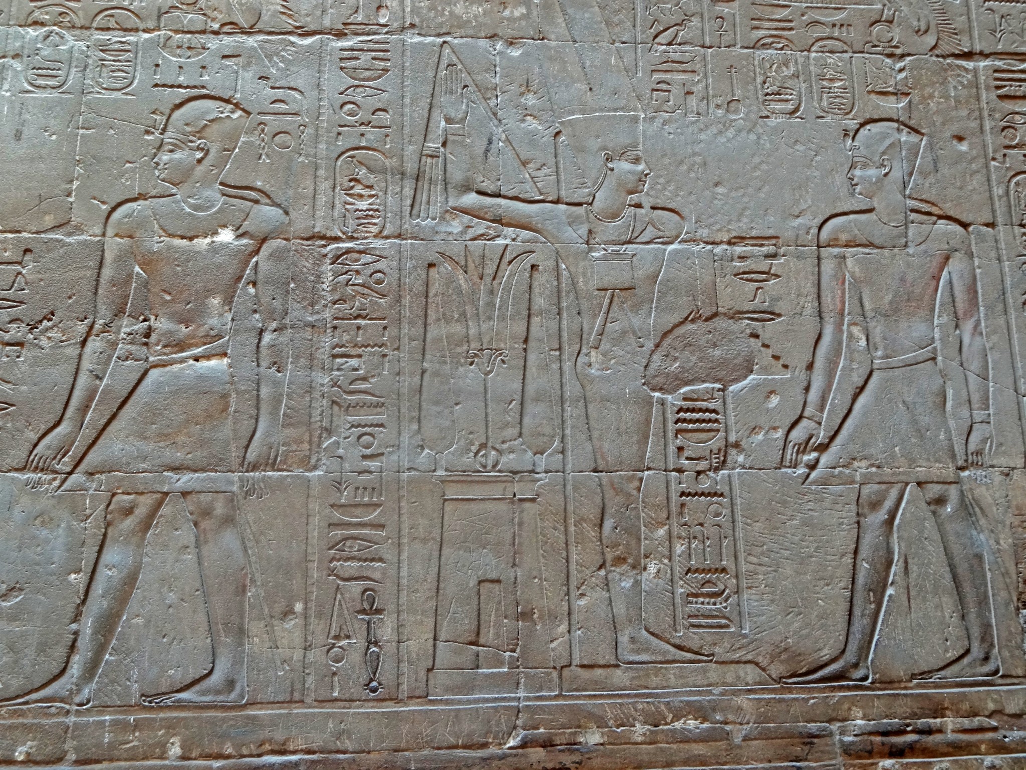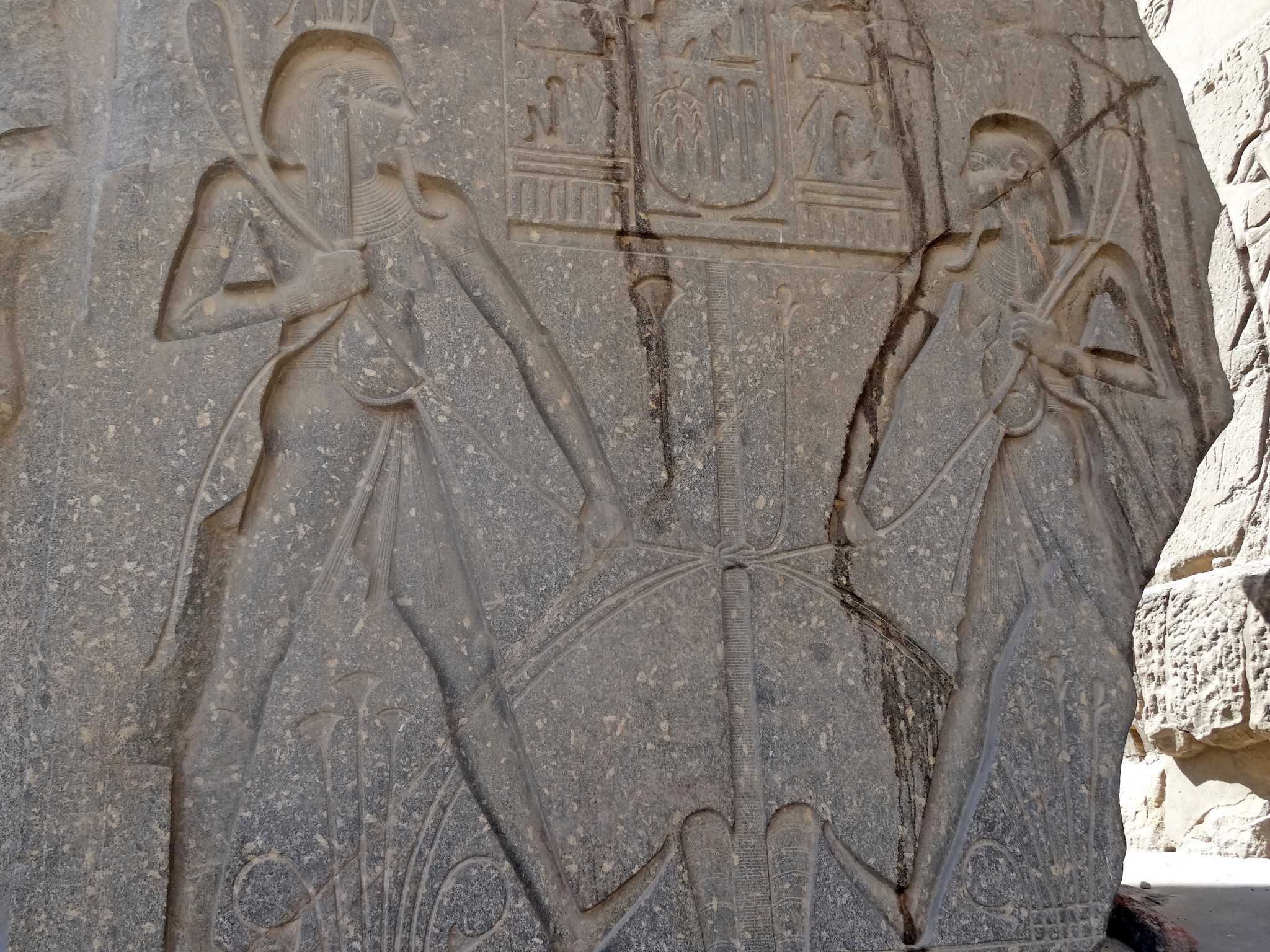 座像の台座には、上エジプトと下エジプトの象徴である蓮の花とパピルスを持った姿で向かい合い、まんなかでしっかりと結び合って上下エジプトの統一を表したレリーフがある。