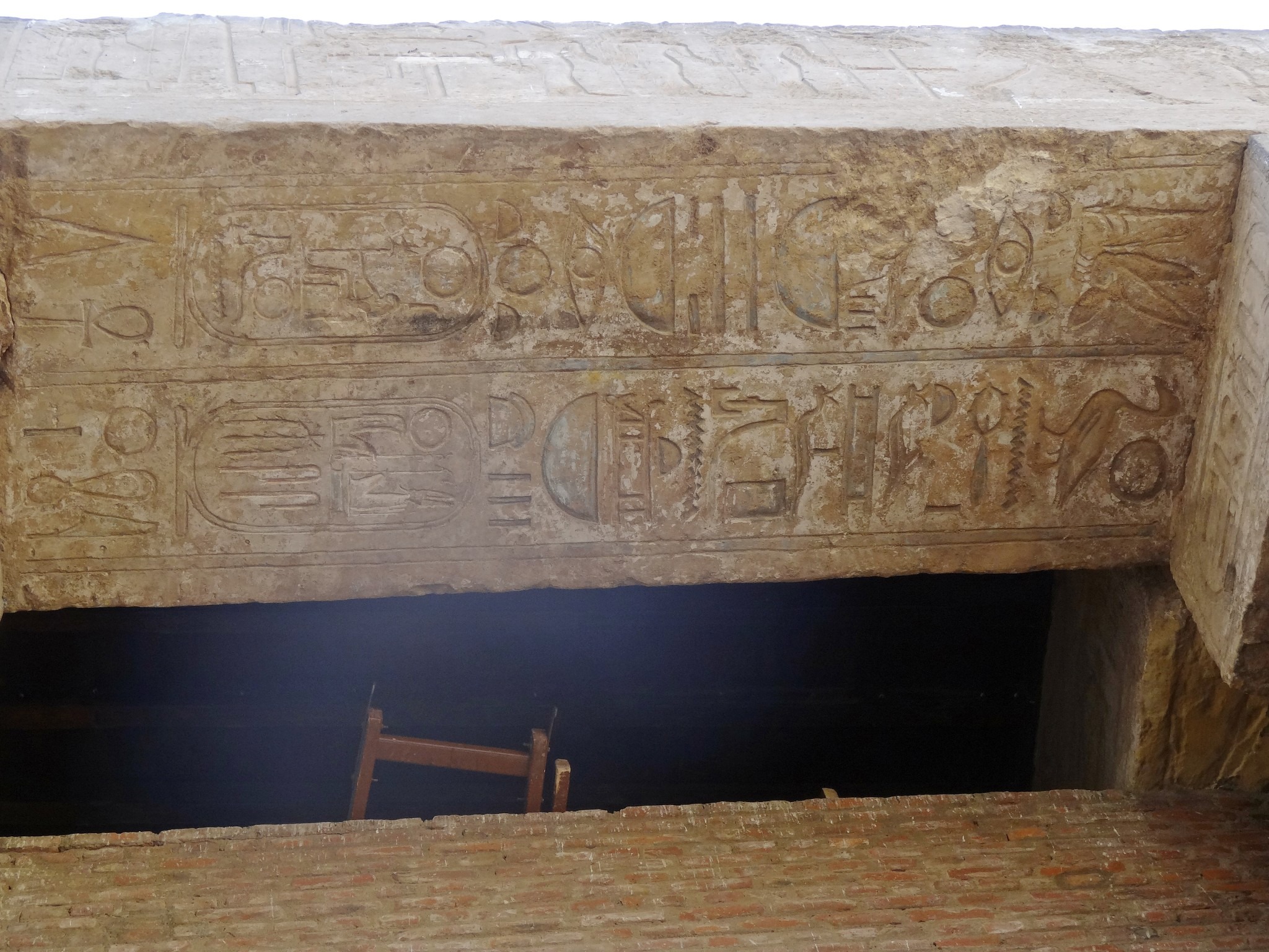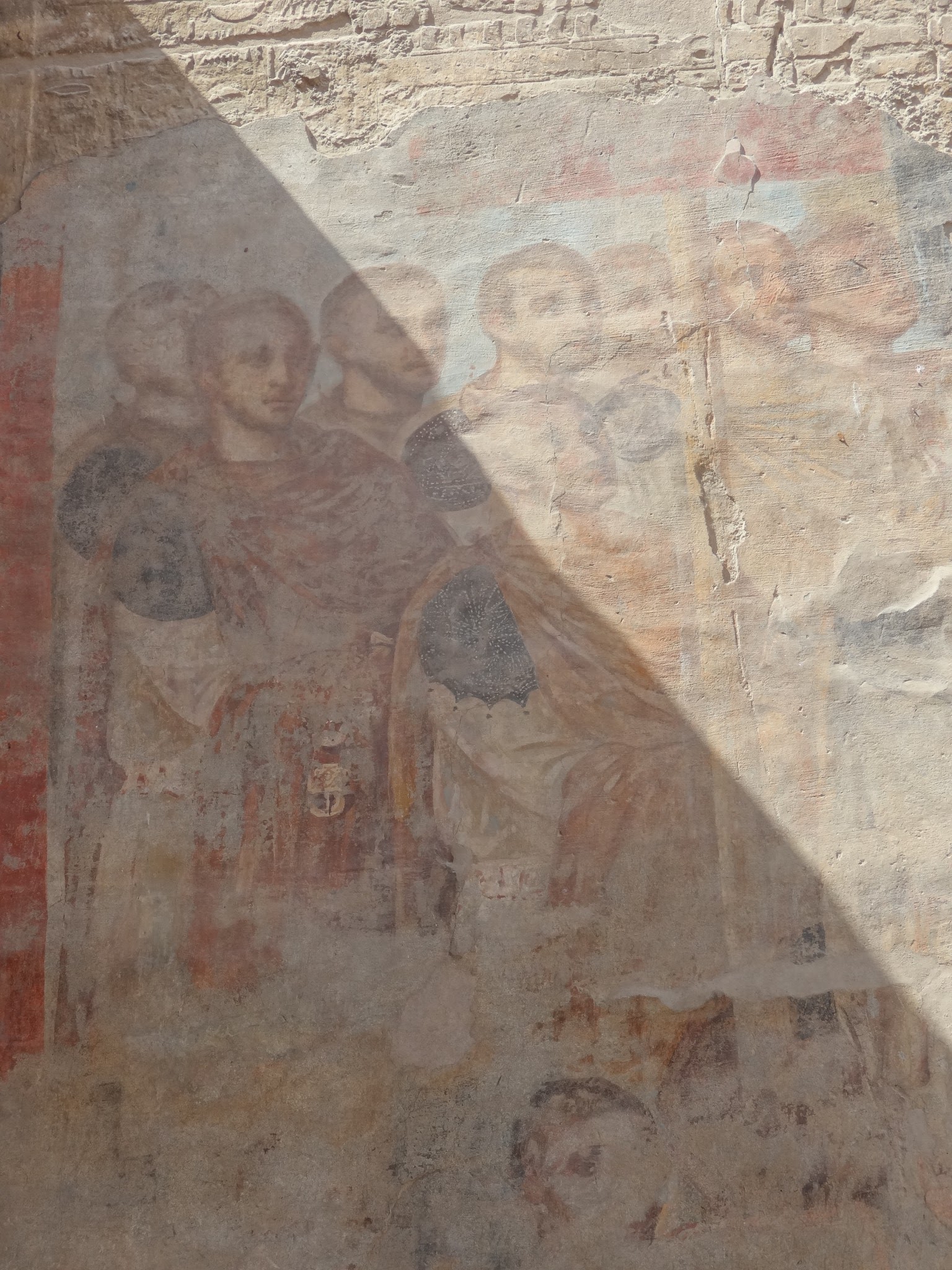 奥にへこんだ半円のくぼみが見えるのは、後世にキリスト教の教会として使われていた跡で、脇にはレリーフを塗りつぶしてフレスコ壁画を上から描いたものが一部残っています。下から覗く古代エジプトのレリーフとのミスマッチ(^^;)
