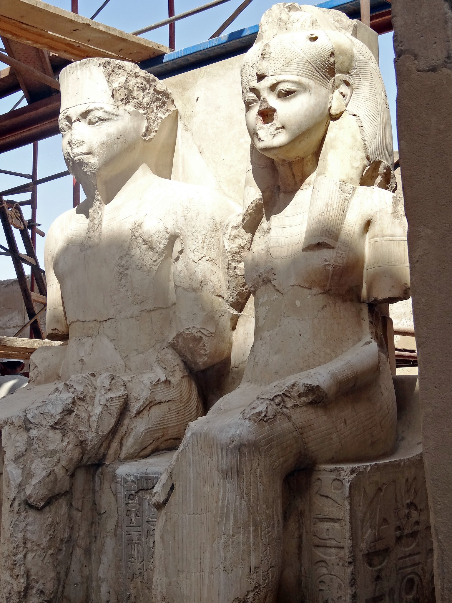 ツタンカーメン王とアンケセナーメン王妃の像。周囲が修復中でなにやら工事現場みたいですが(^^;)