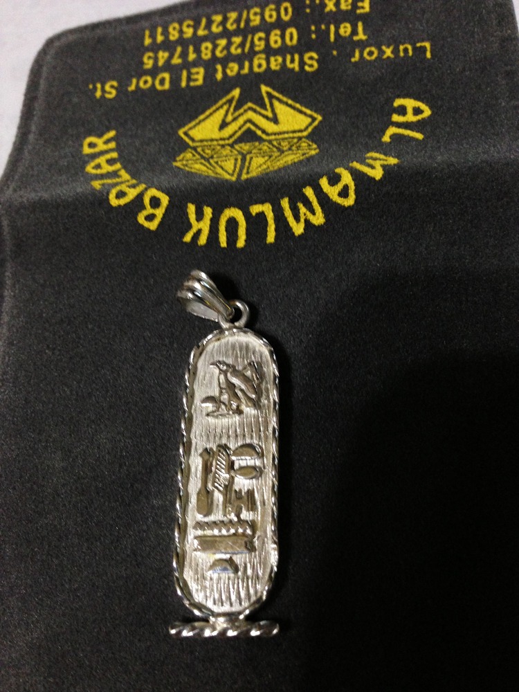 ここでは古代エジプトにちなんだデザインのアクセがいろいろありますが、特におすすめがカルトゥーシュ(王の名前をロープで作った輪の中にヒエログリフで端的に表したもの)の形をしたペンダントヘッドで、片面に各ファラオや王妃のカルトゥーシュがデザインされており、片側に自分の名前をヒエログリフで入れてもらえます。