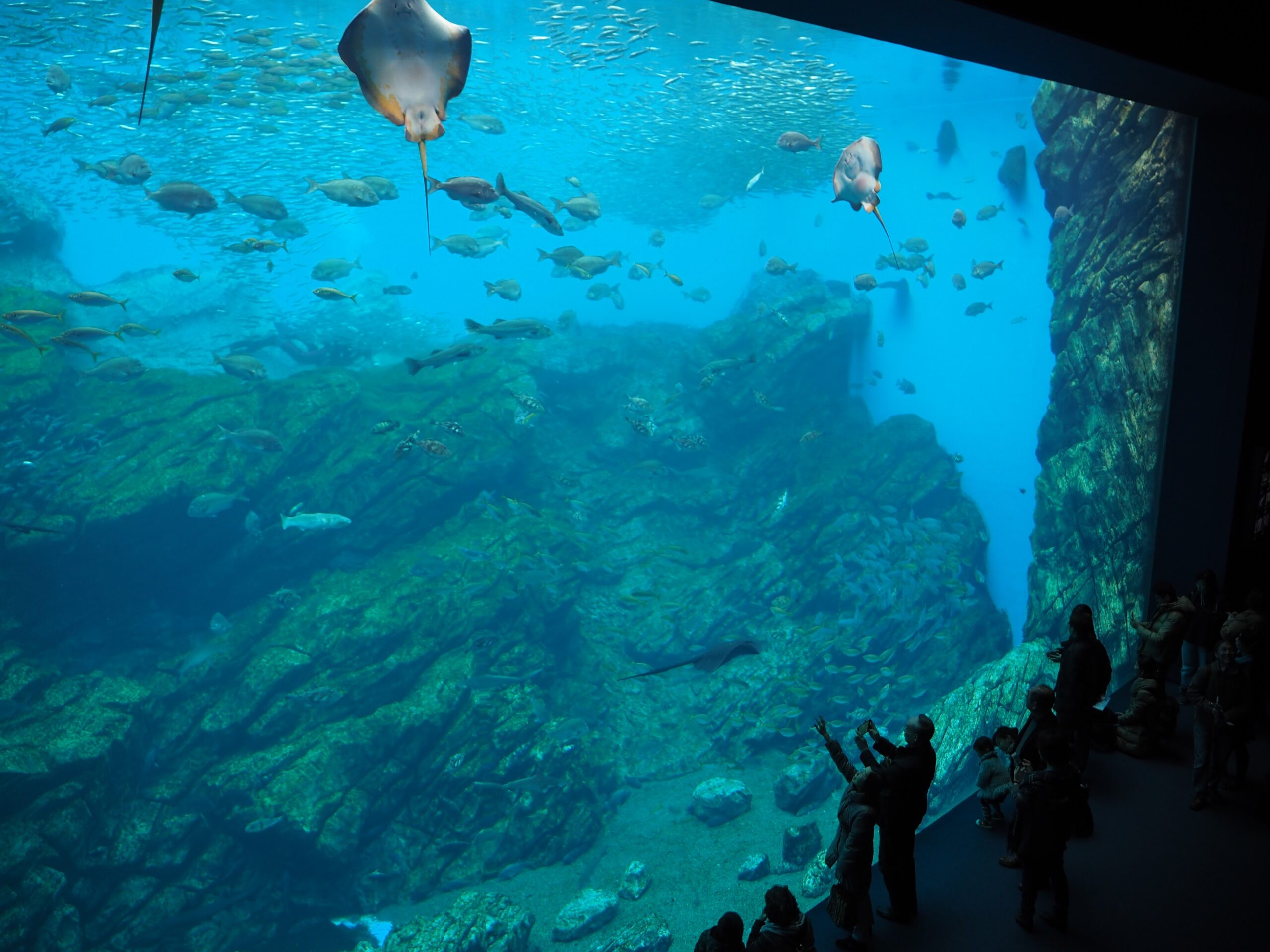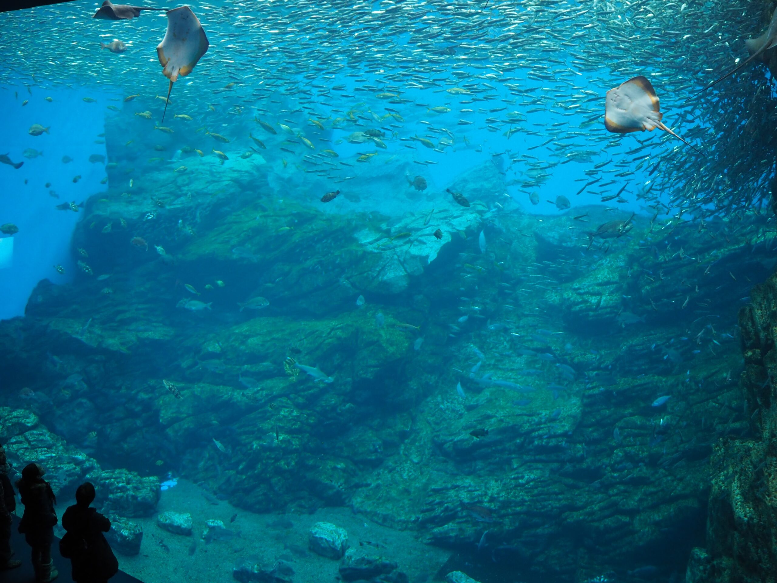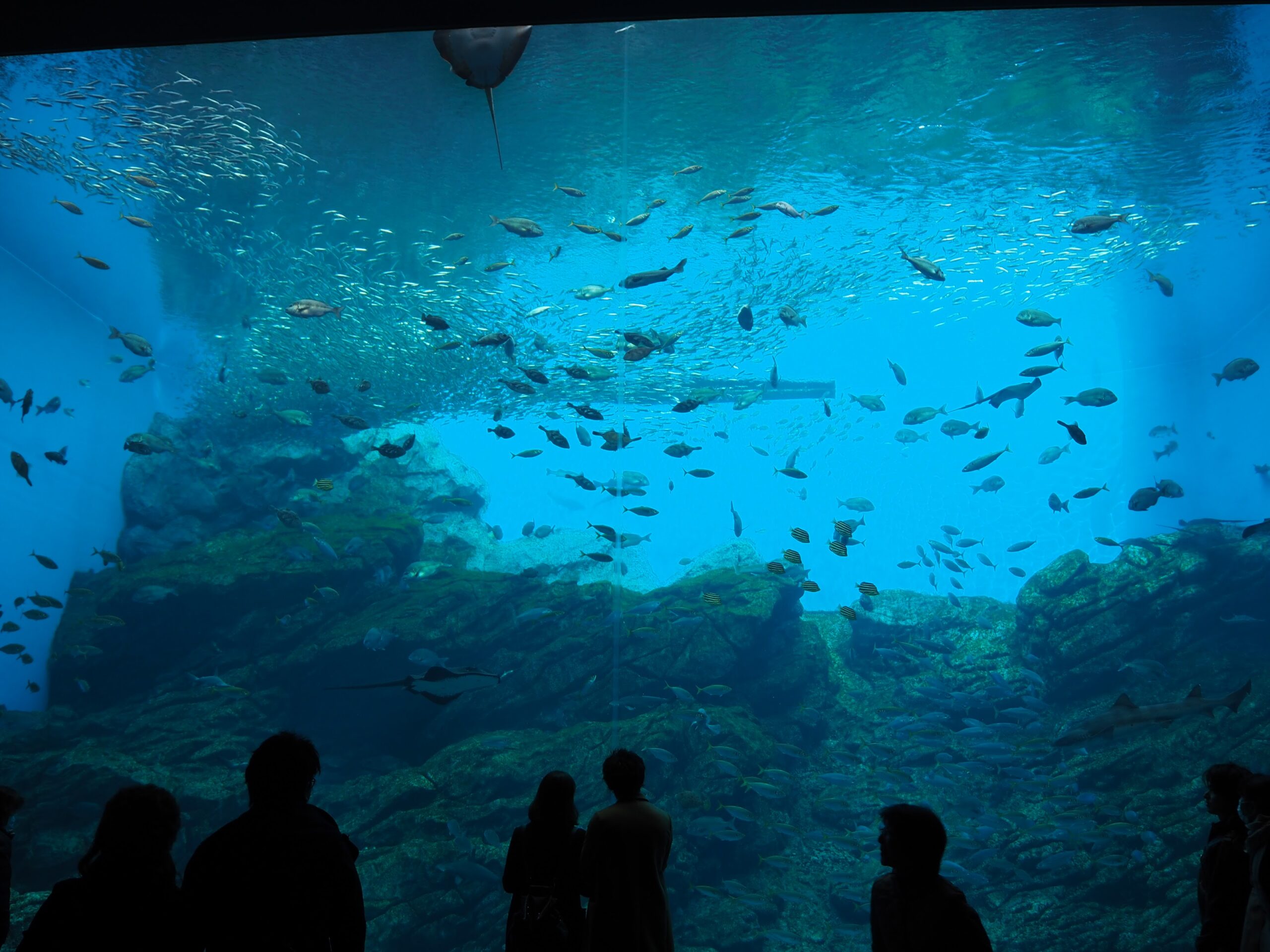 トンネル抜けたら広がる大水槽。「いのちきらめく うみ」は、寒流と暖流がぶつかる三陸の海を模したもの。イワシの群れが踊ってたり、ハンマーヘッドが泳いでたり