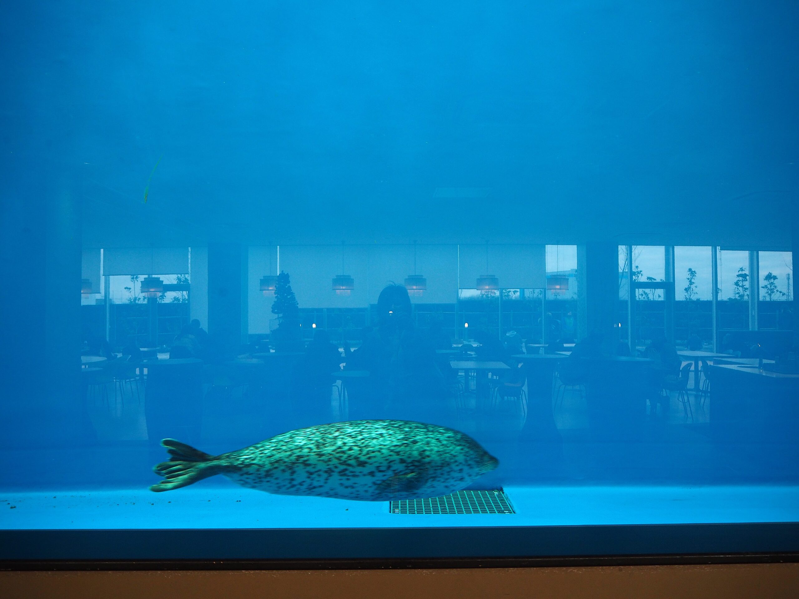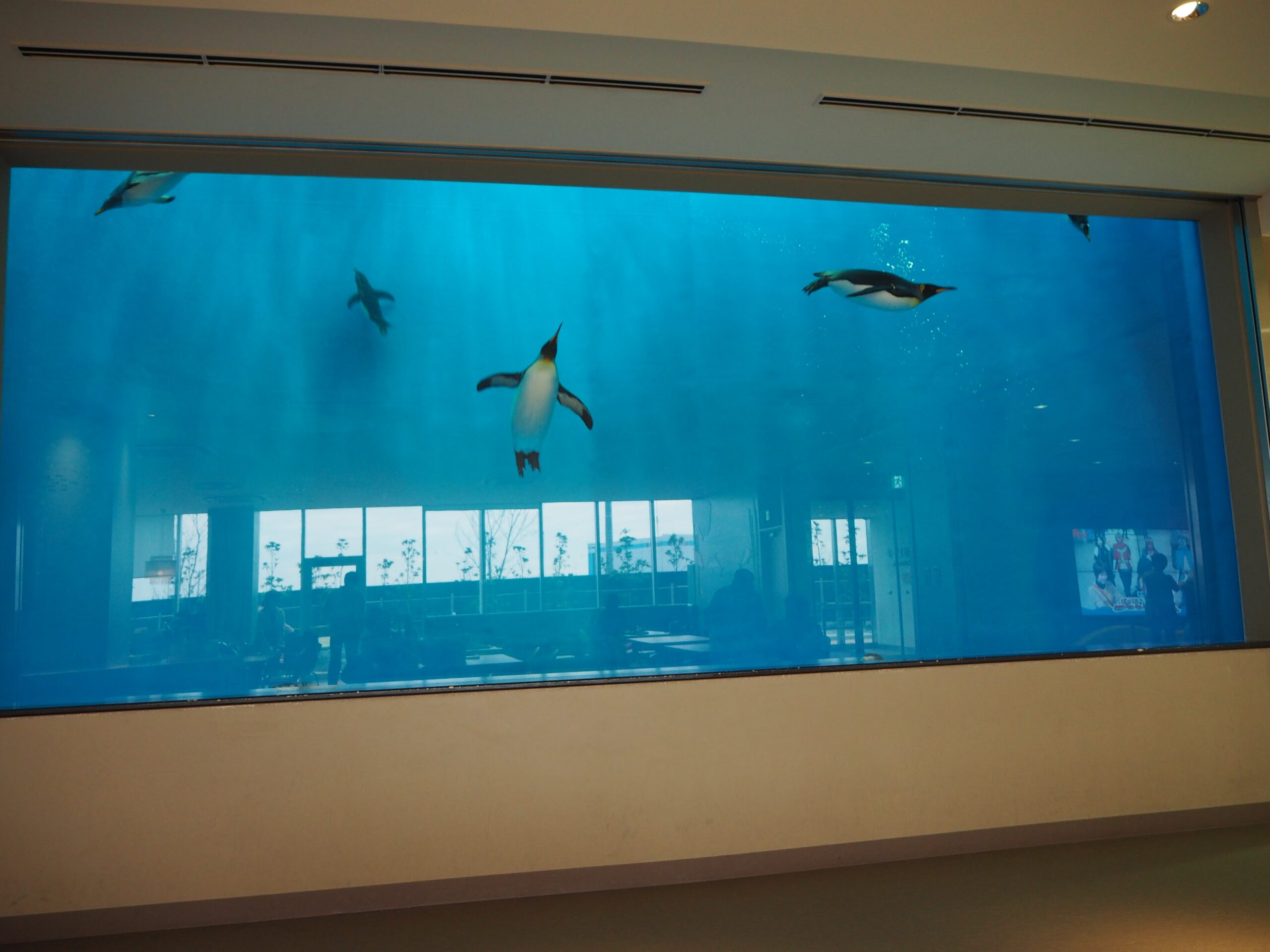 出口近くにフードコートとおみやげ屋があるが、このフードコートが、なんとペンギン水槽とアザラシ水槽がずっぽりと壁に組み込まれているので、休憩しながら泳ぐ姿をみれるのです。