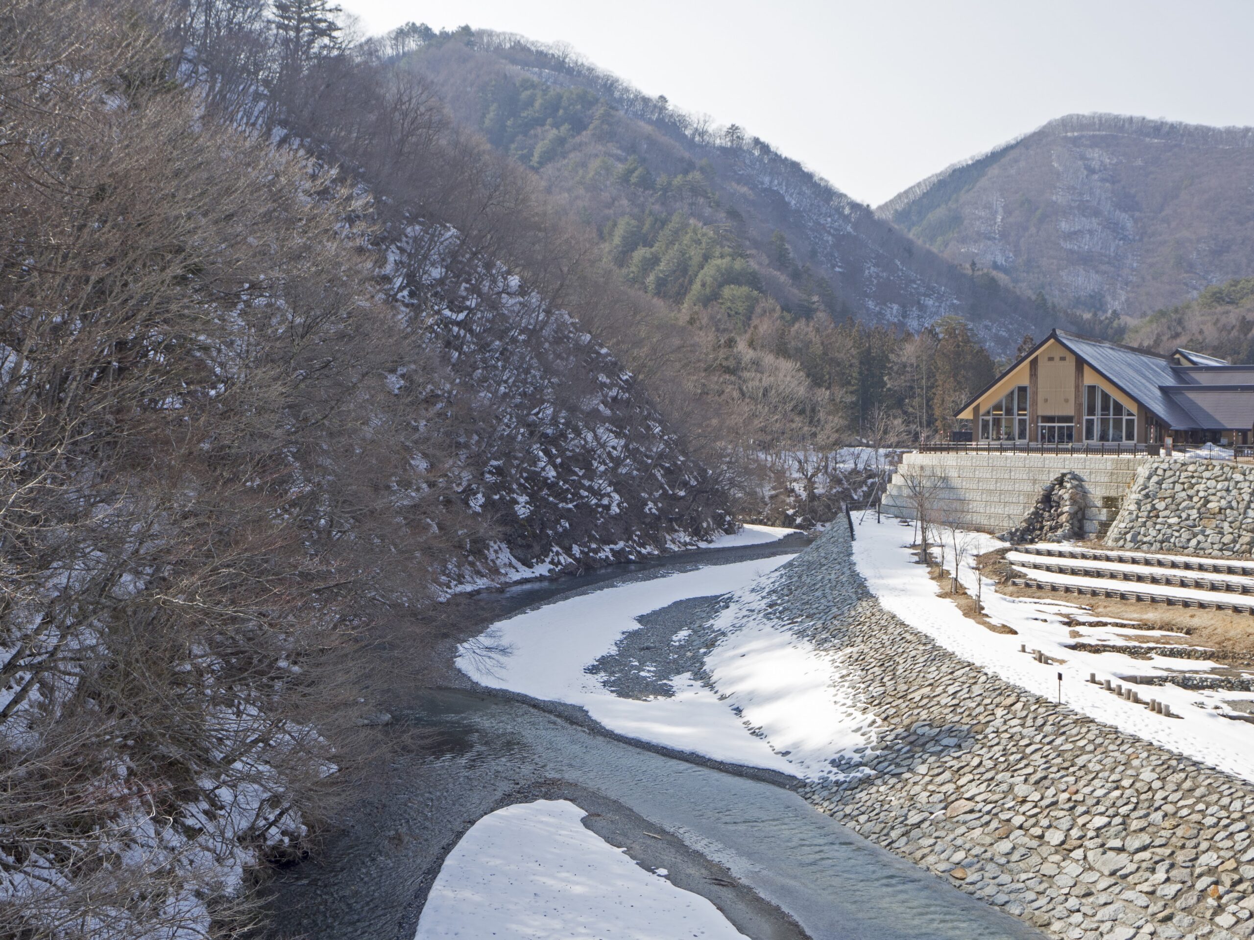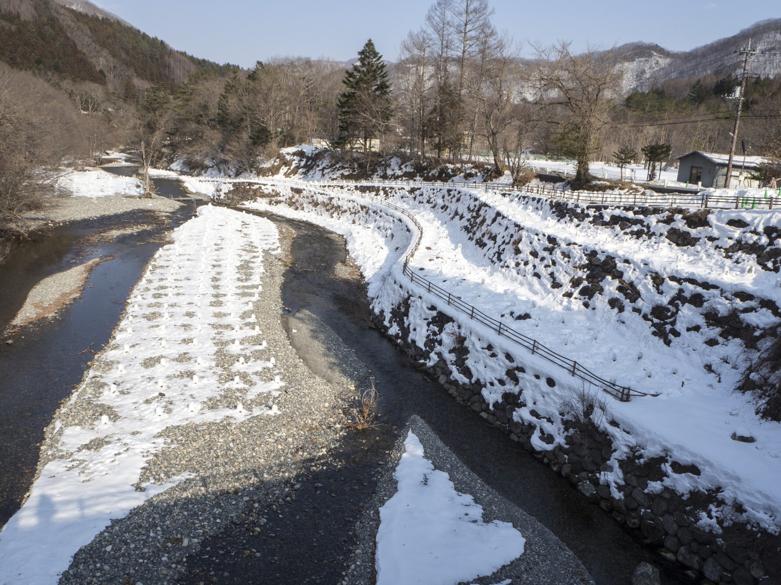 今年のメイン会場は「平家の里」となっているけれど、景色として「おぉ~~っ!!」と見ごたえあるのは、もうちょっと先の上流にある「沢口河川敷のミニかまくら」の方です。