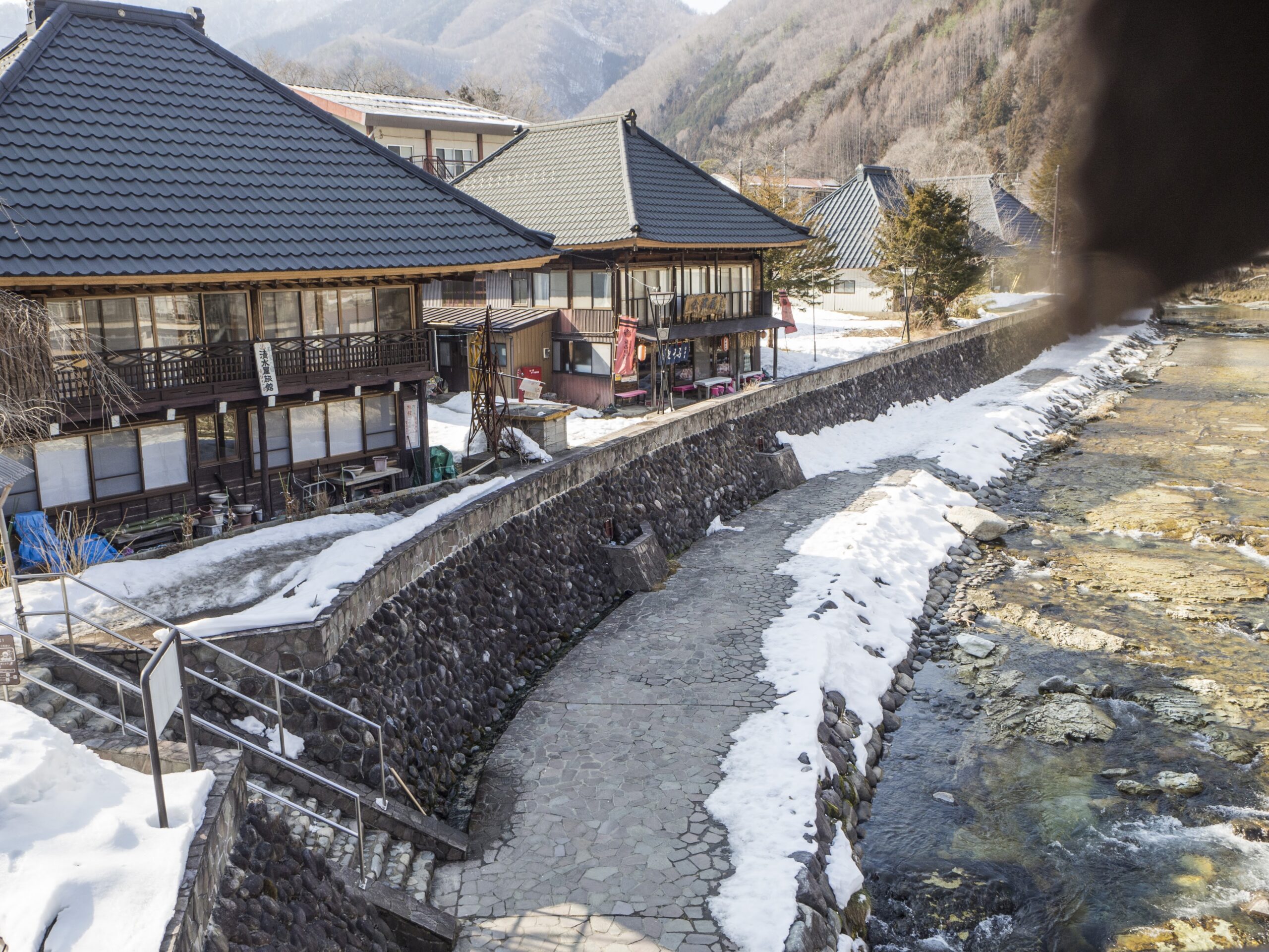 ちょうど橋の両側に共同浴場の内湯と露天、逆側の橋の下に囲いもない混浴露天がありますが、橋の上から丸見えなので女性はきついですな。