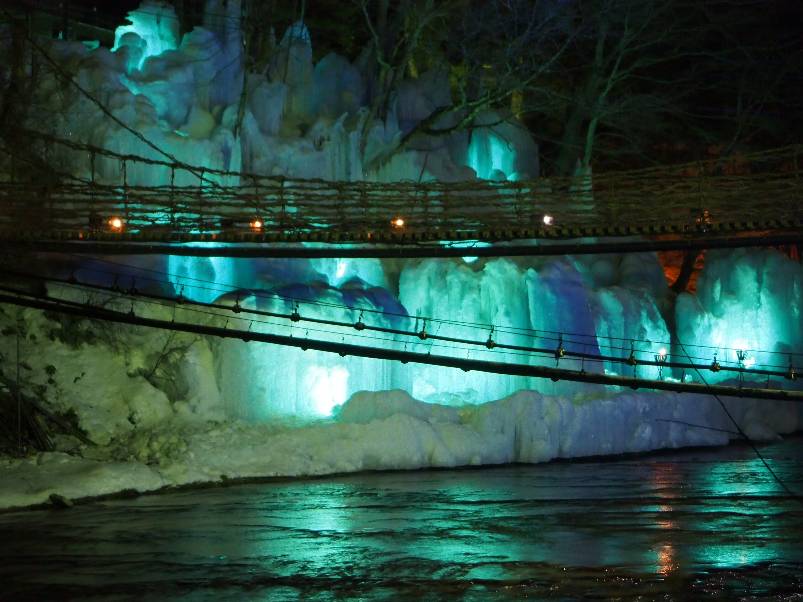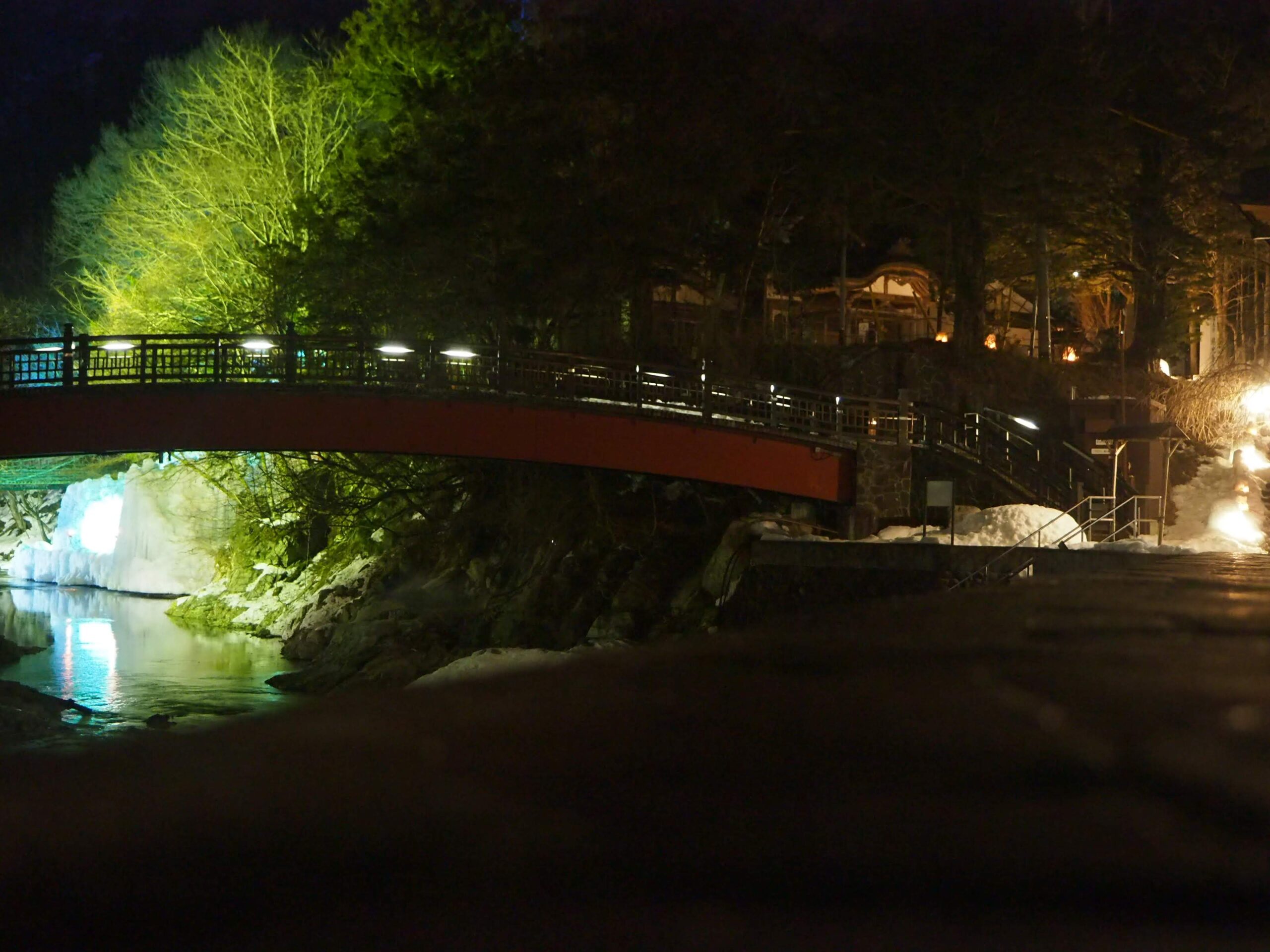 そして橋から見える青い光がめっちゃ気になる。どうも「伴久」さんの目の前にあるようだ。老舗旅館オリジナルライトアップかな?
