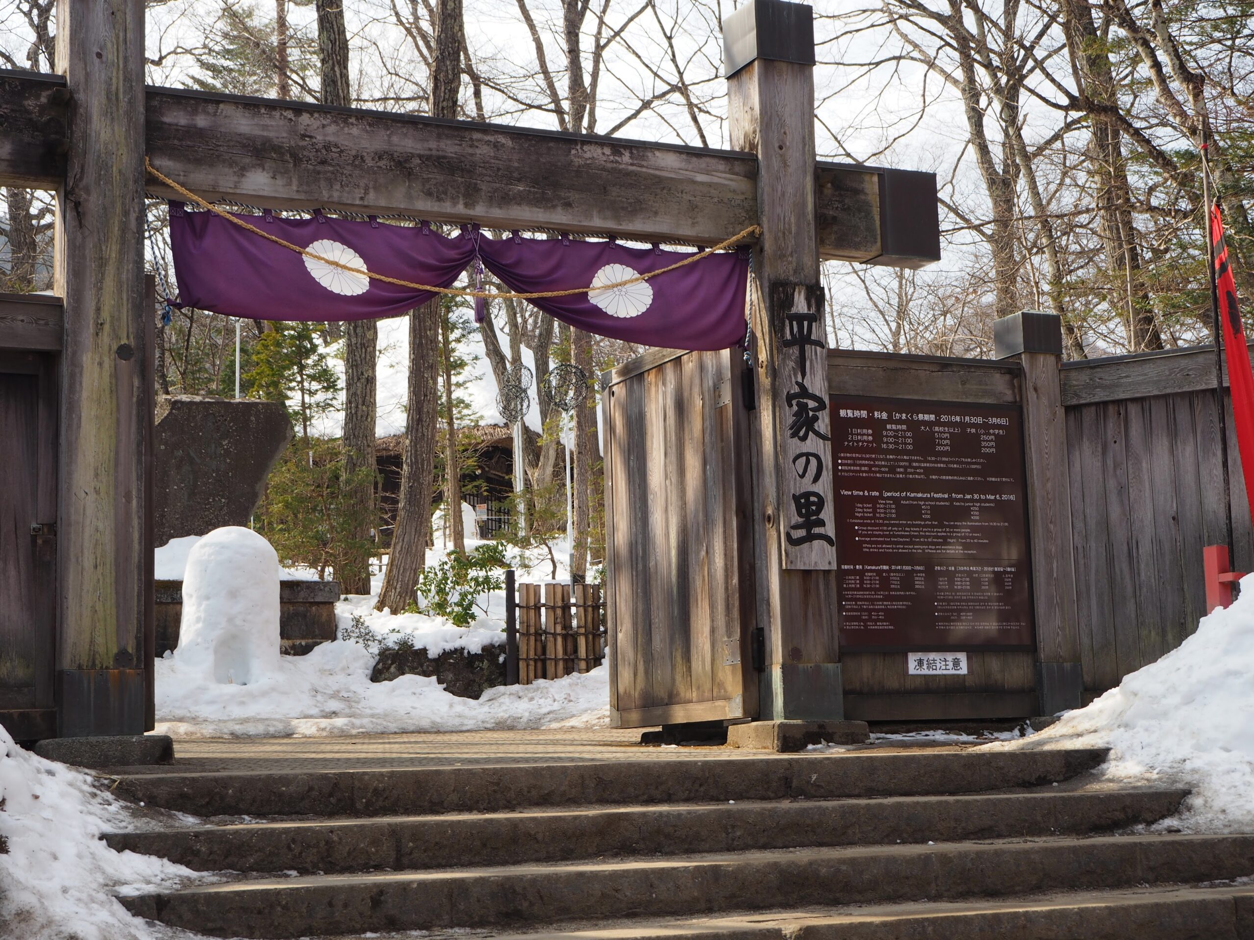 それではかまくら祭の様子にいきます。まずこれが昼間の入り口。雪景色が似合う渋い佇まいです。