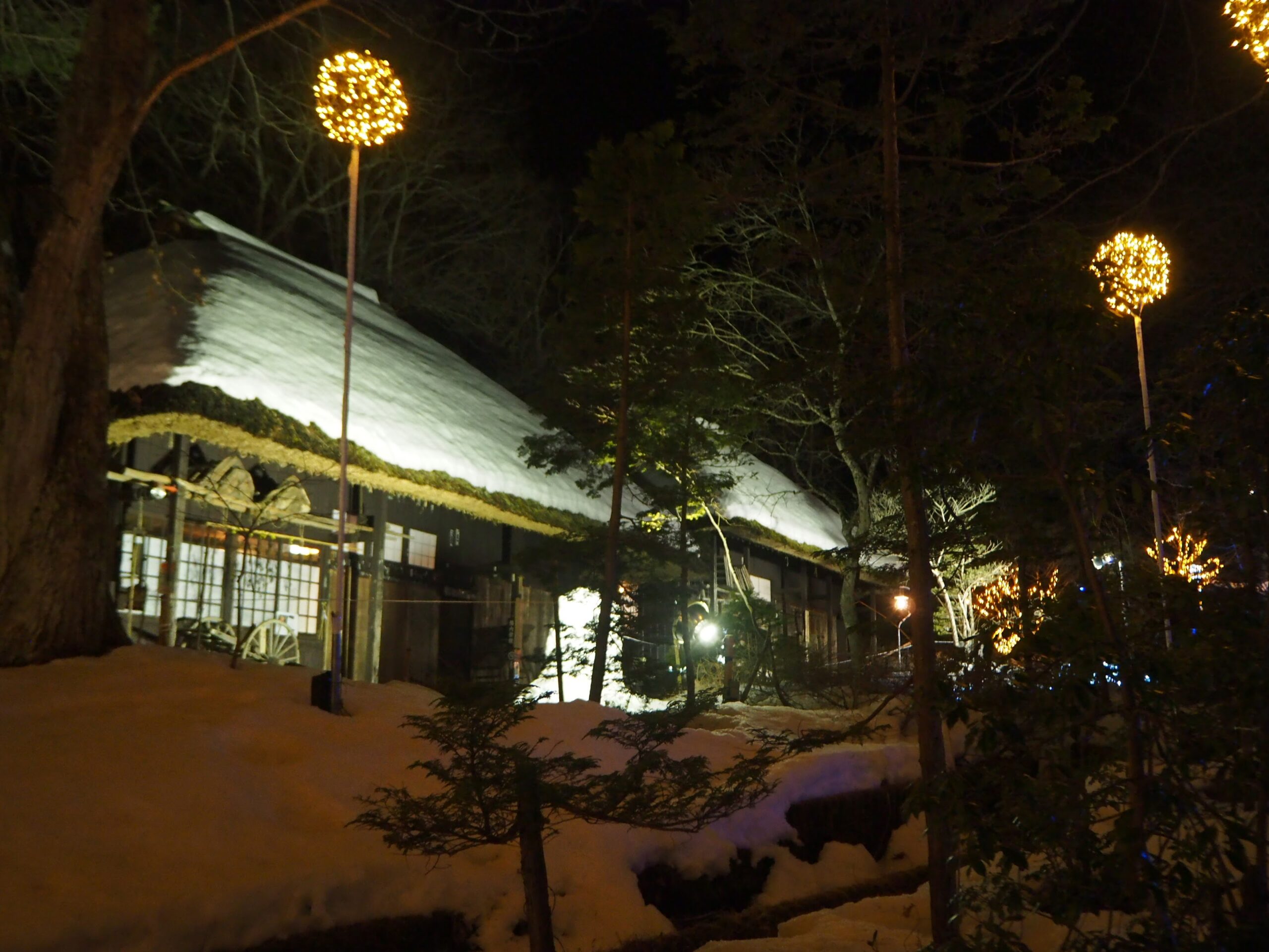温泉街の近くの橋の脇「平家慈光寺」でもミニかまくらやってました(下の写真右端)。真っ暗な境内のお墓の目の前にかまくらが(^^;)