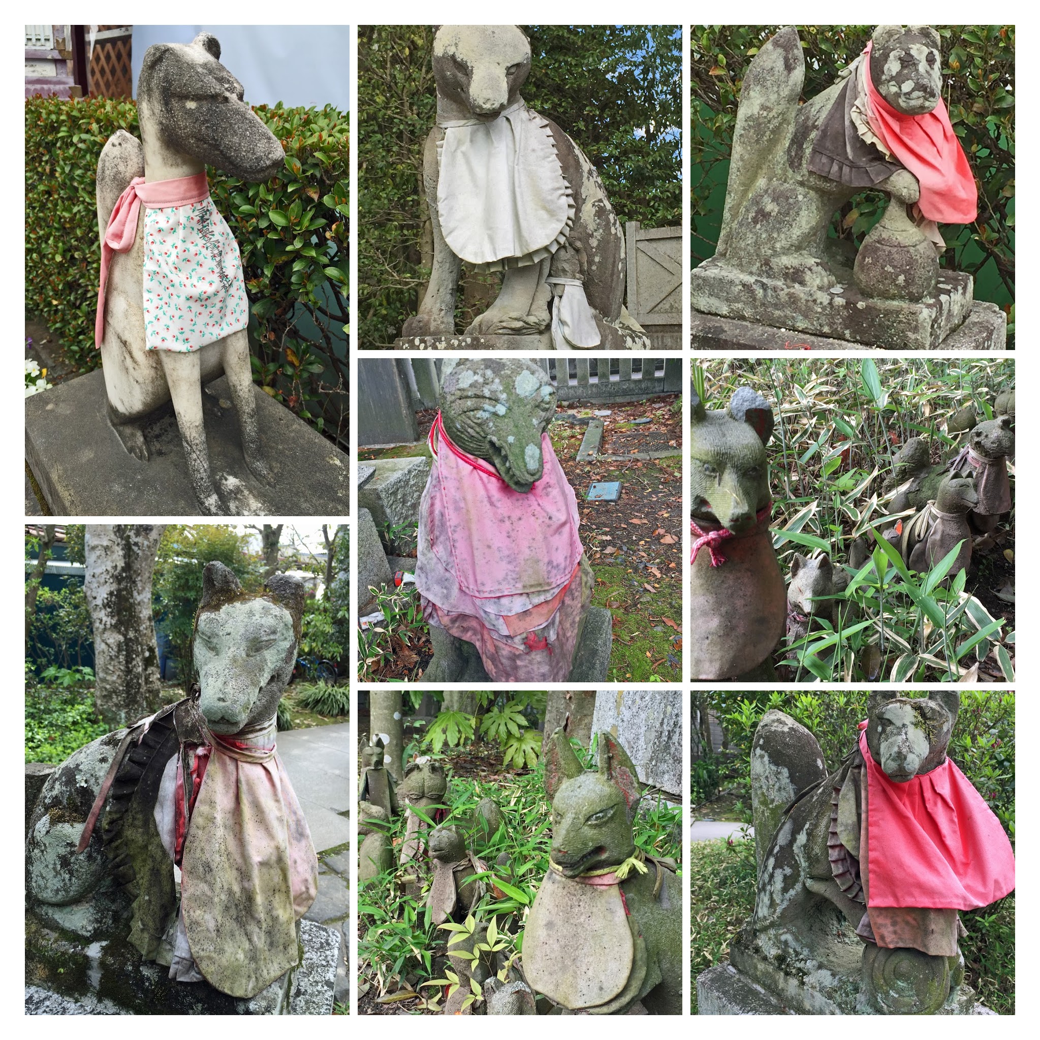 あくまでお稲荷さんがキツネなわけではなくて、稲荷大神のお使いとしてキツネの像がたくさん見られます。新旧複数味のあるものがたくさん。