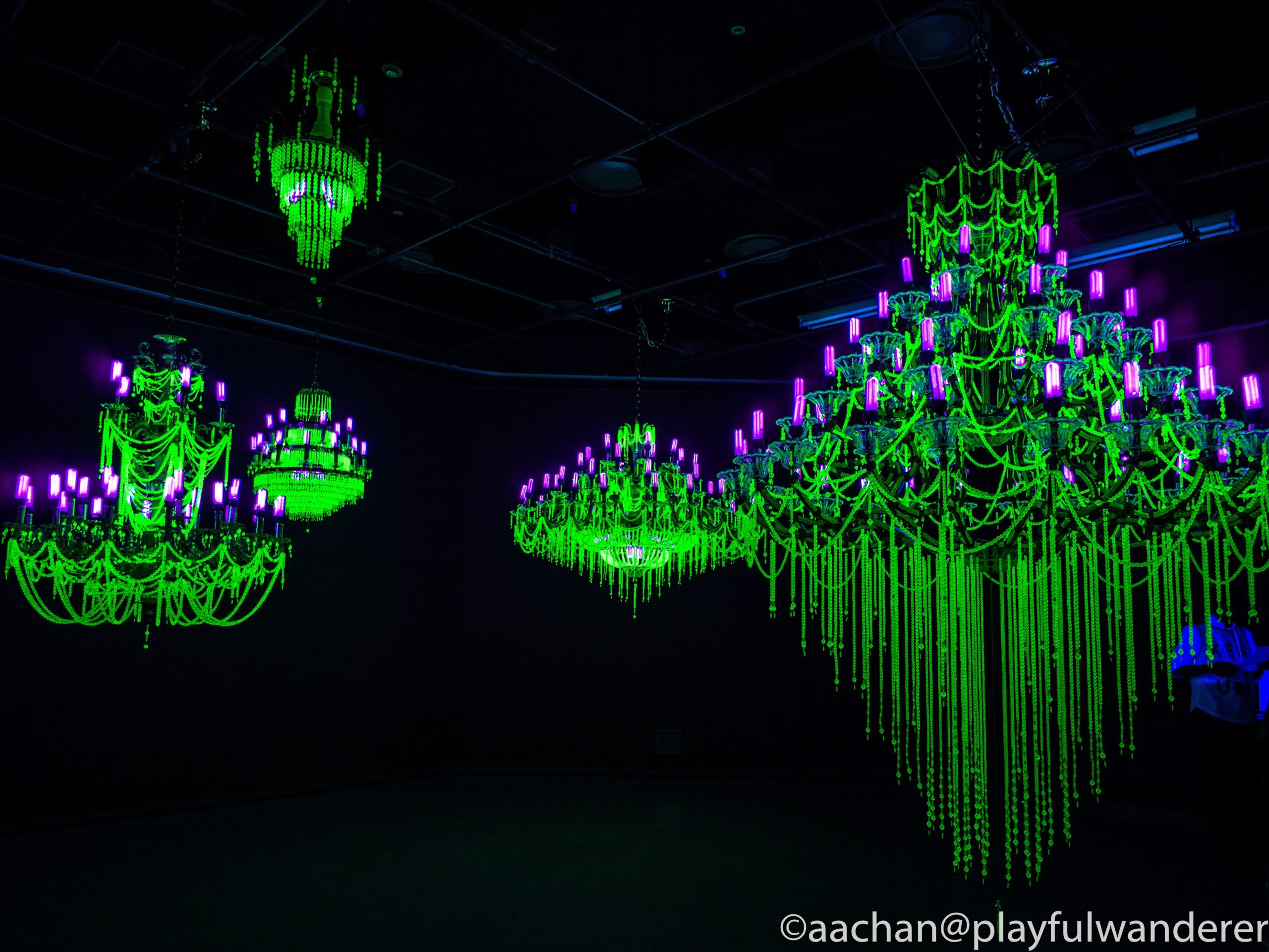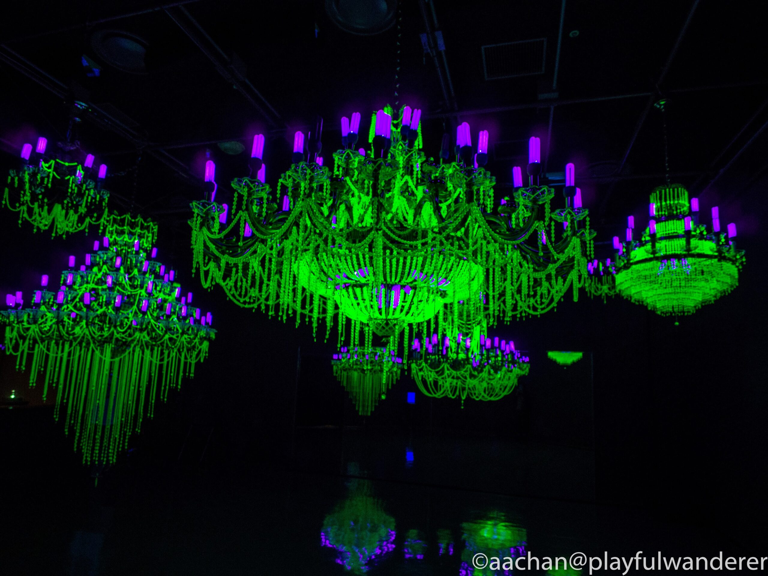 蛍光色のネオンが浮かび上がる豪華なシャンデリアに見えますが、これは「ウランガラス」をブラックライトで浮かび上がらせたもの。