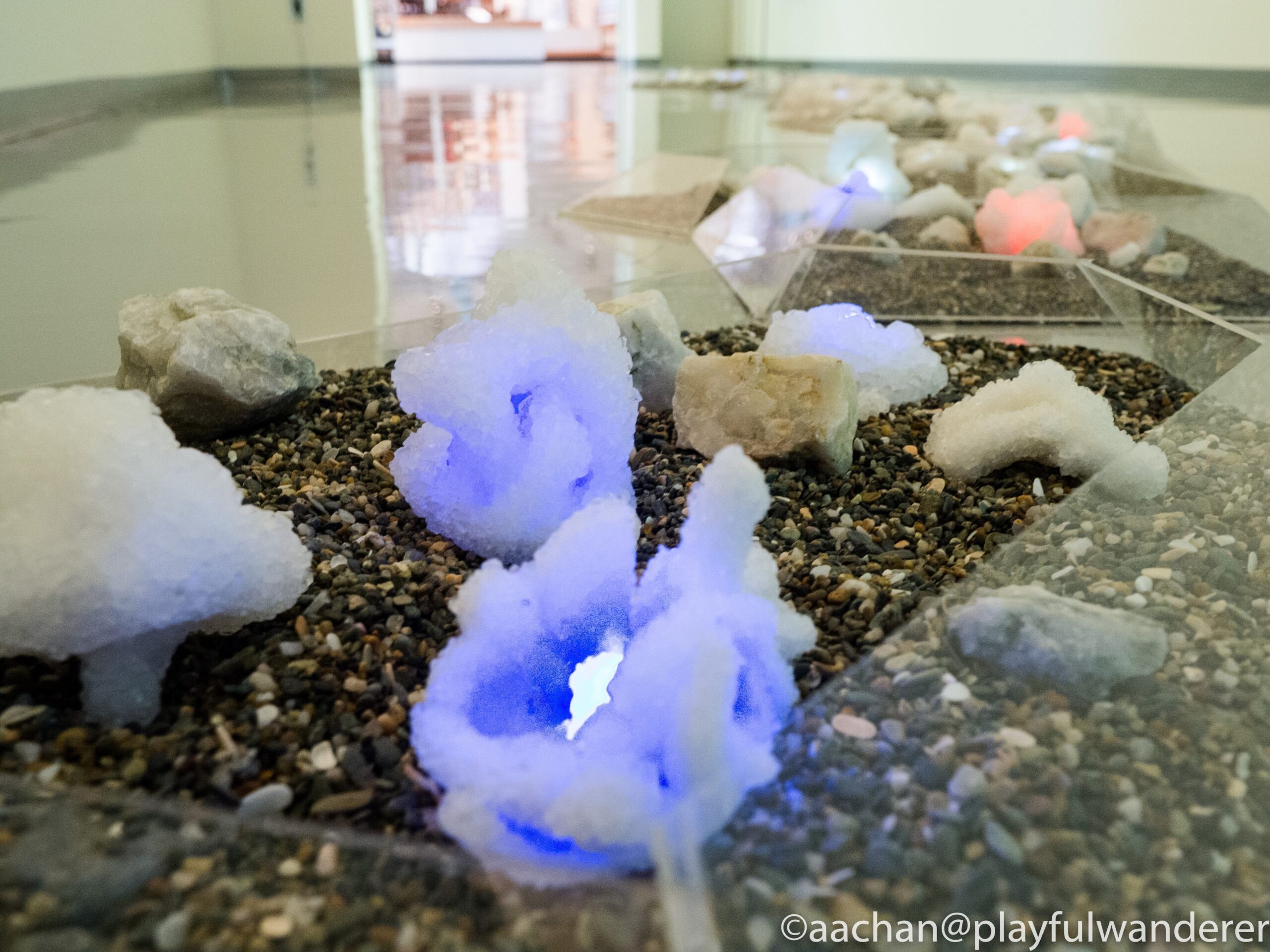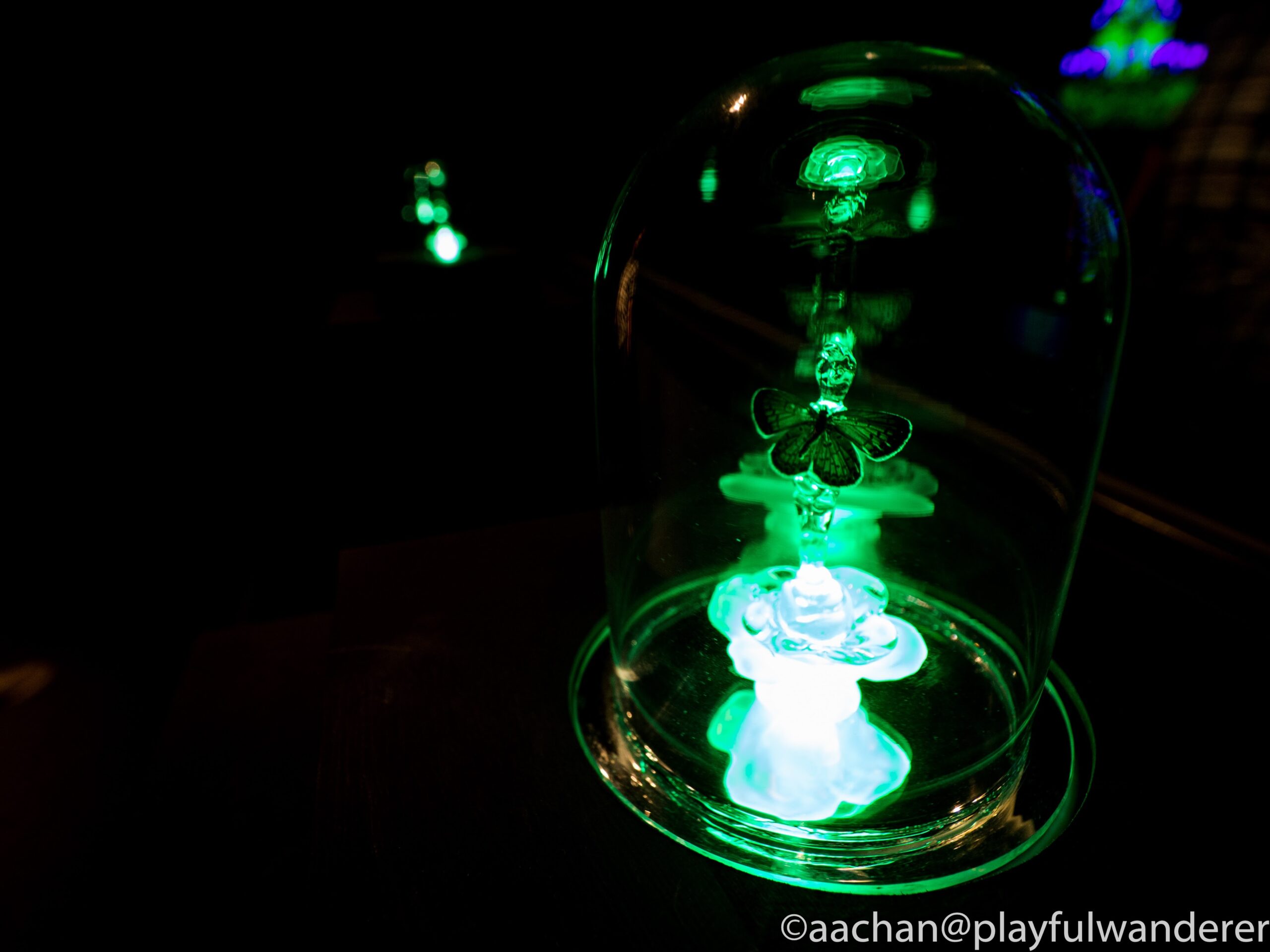 ホウ酸ナトリウムでできたクリスタルが様々な色に光っている。ある程度持ち上げると光は消えるんだけど、低い距離だと点灯する。ふむふむと上下してみる。