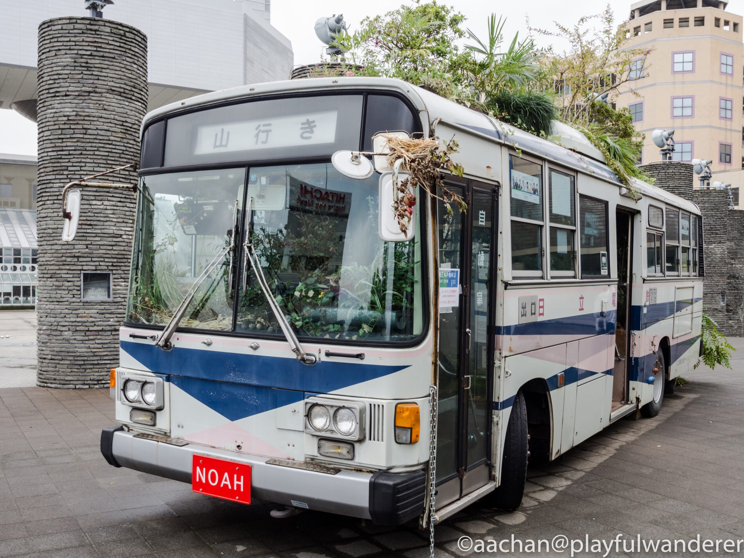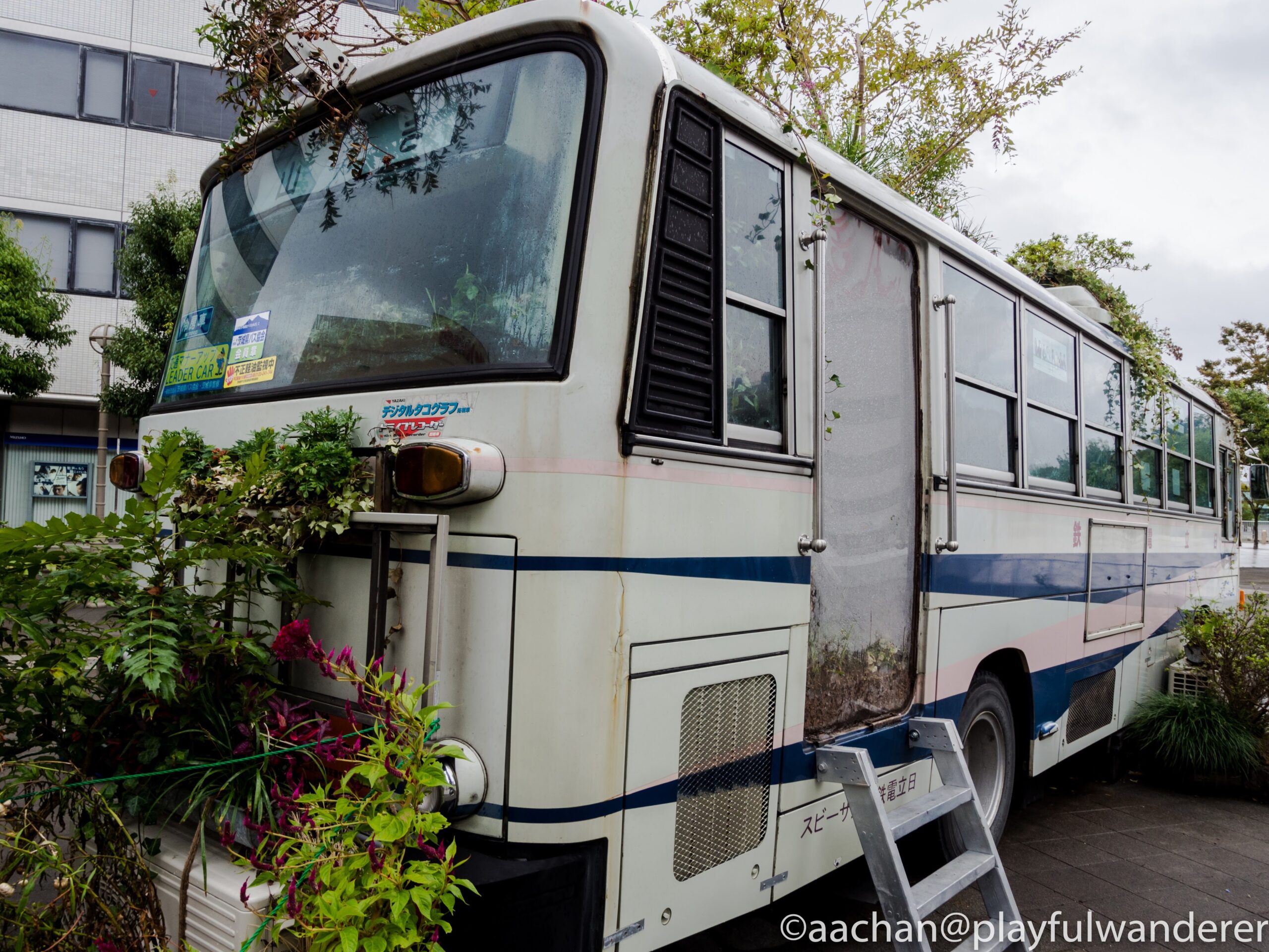 中にも外にも植物がわさわさ生えていて、一見すると打ち捨てられた廃バスなんだけど