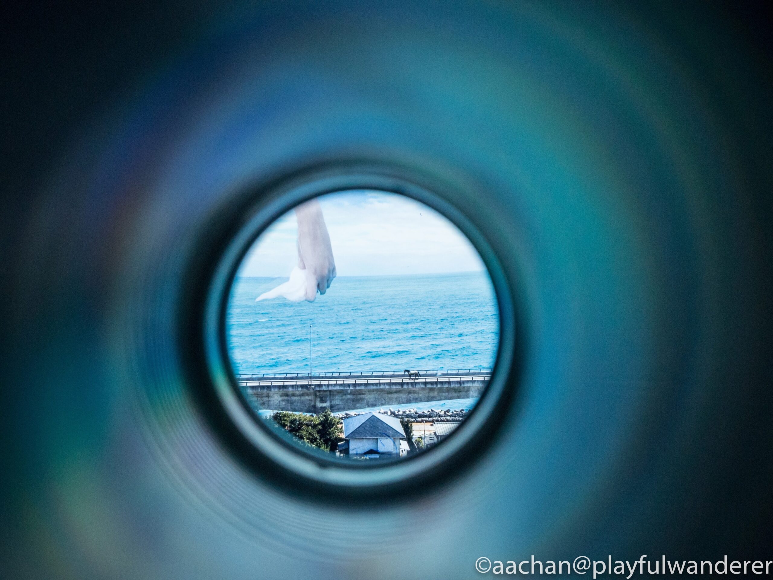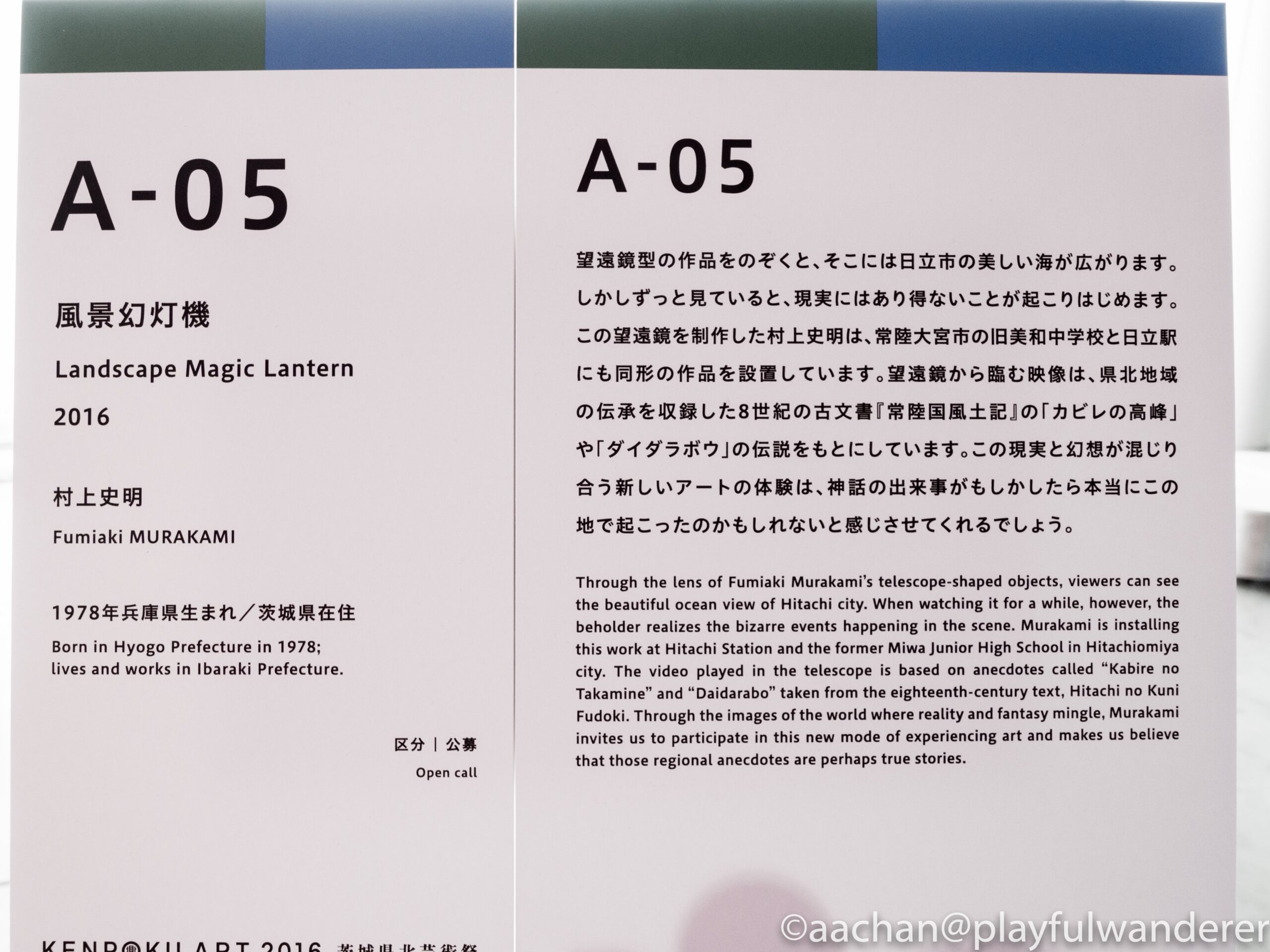 常陸大宮エリアにある旧美和中学校に展示されていたものの違うバージョンで、覗き込むと現実の風景に重なるようにして非現実のアニメーションが現れる。