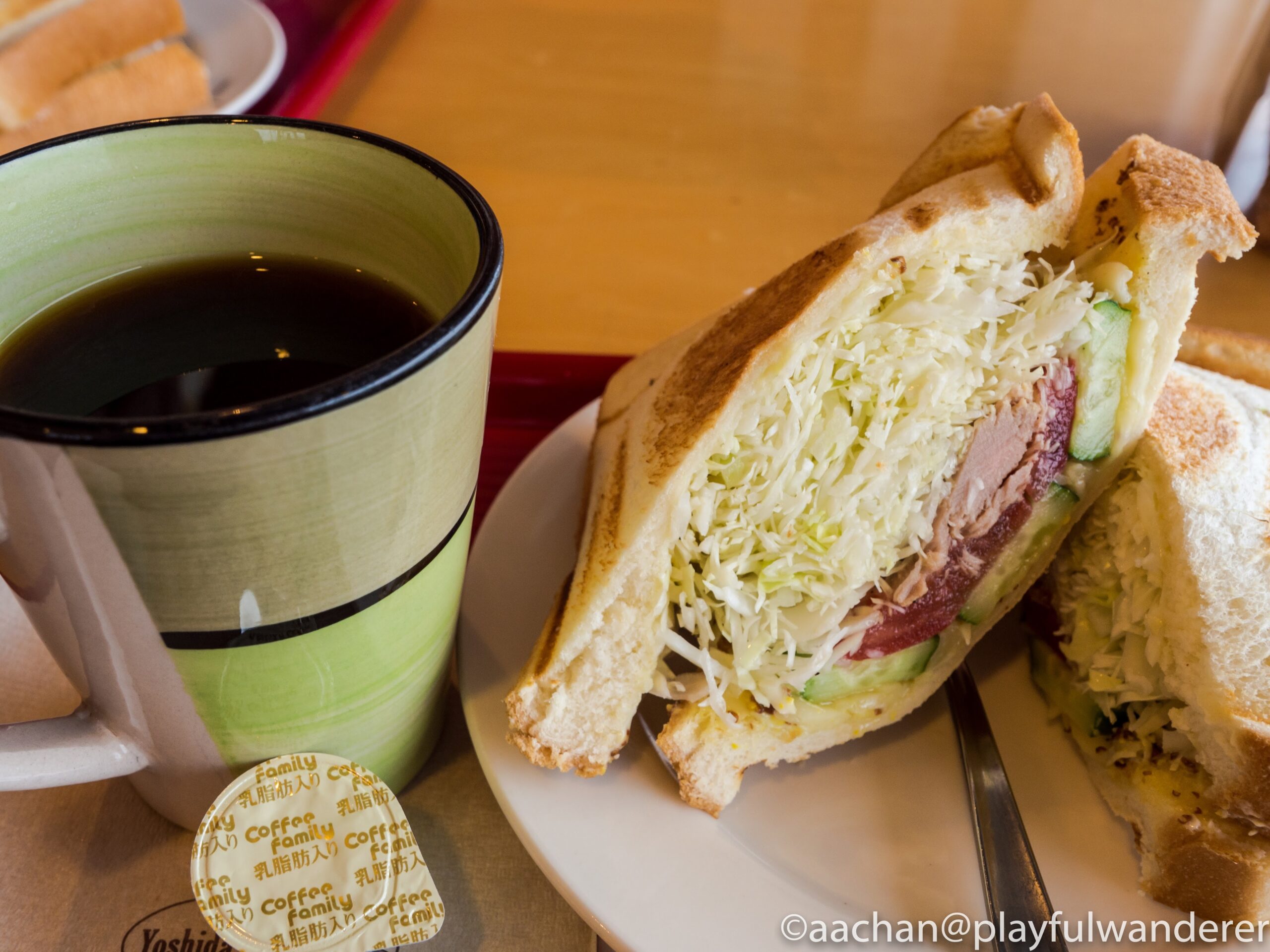 次のポイント方面に移動して、お昼はかみね動物園のちょっと上の高台にある「吉田正音楽記念館」の展望カフェにて。ボリュームが半端ない焼きサンド。