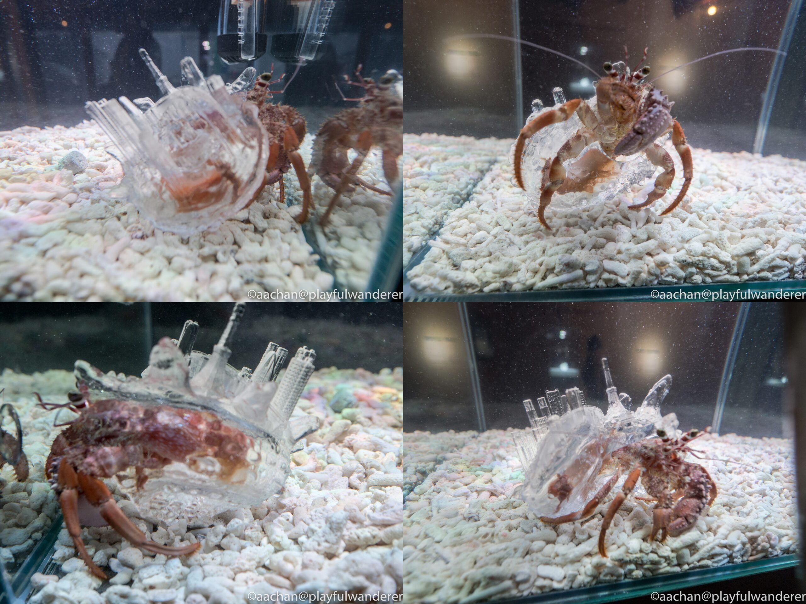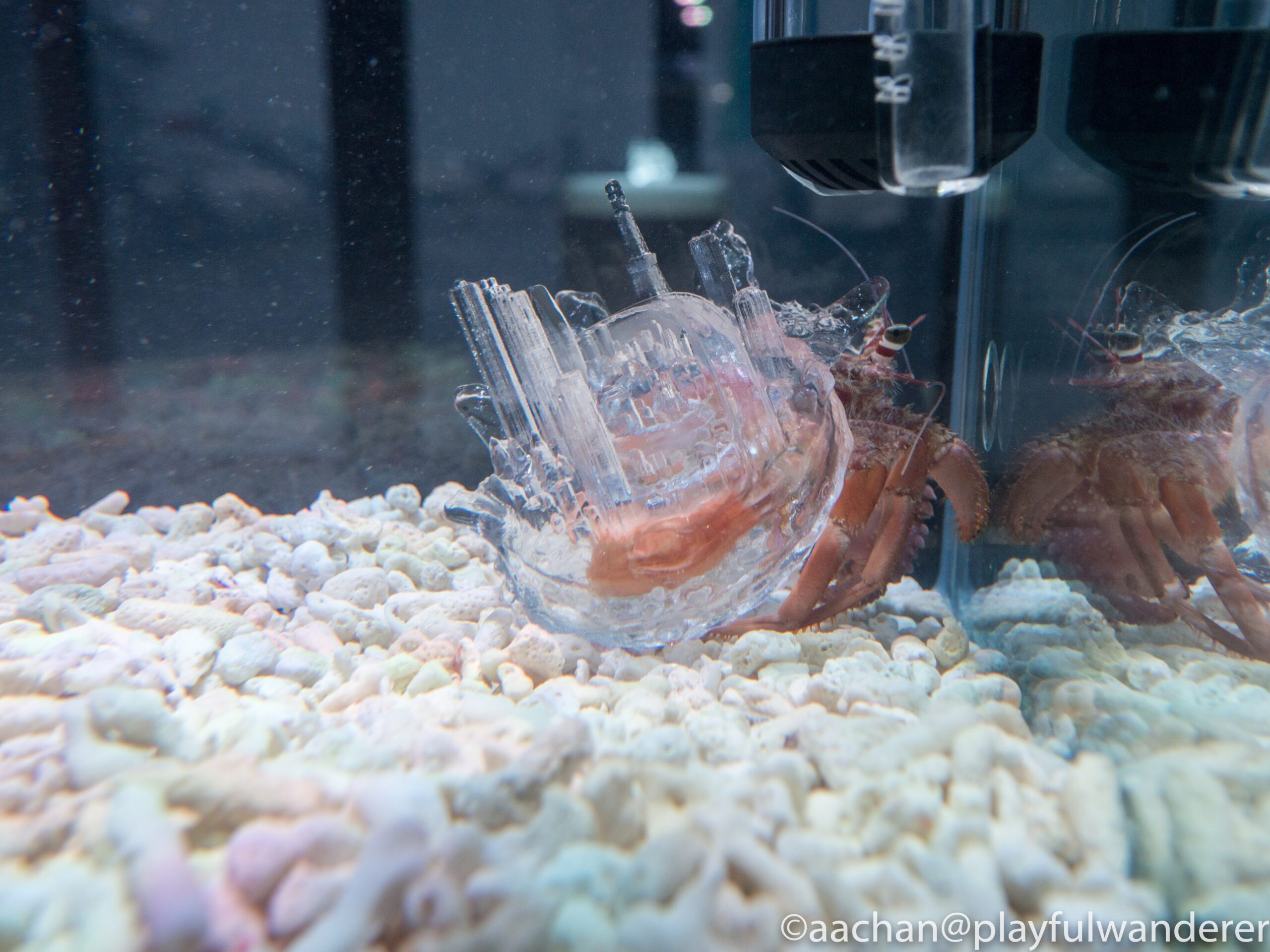 ただ残念なのは、沢山のヤドカリたちが大きな浅い水槽でいっぱいこの美しい”人工殻”に入ってうろうろしてるのを想像してたんですが、実際被ってるのは巨大なの一匹でした。