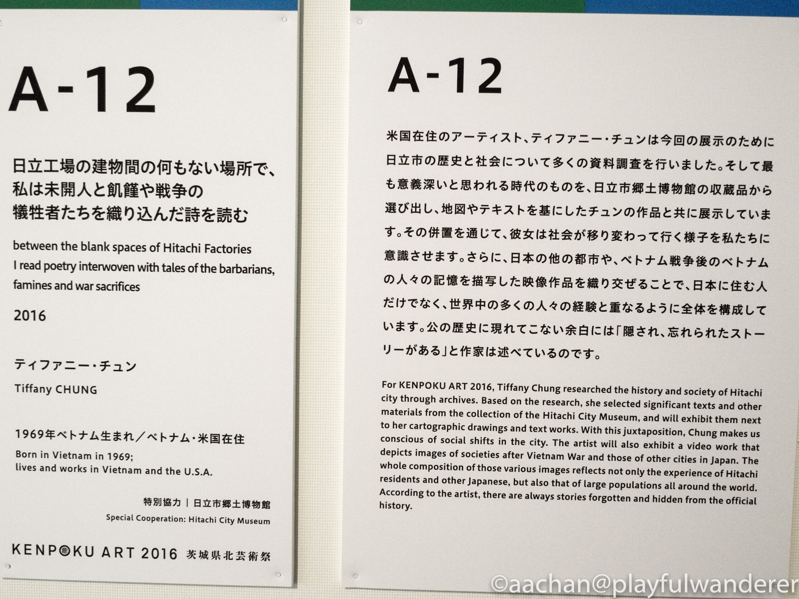 「日立工場の建物間の何もない場所で、私は未開人と飢饉や戦争の犠牲者たちを織り込んだ詩を読む」 (ティファニー・チュン)