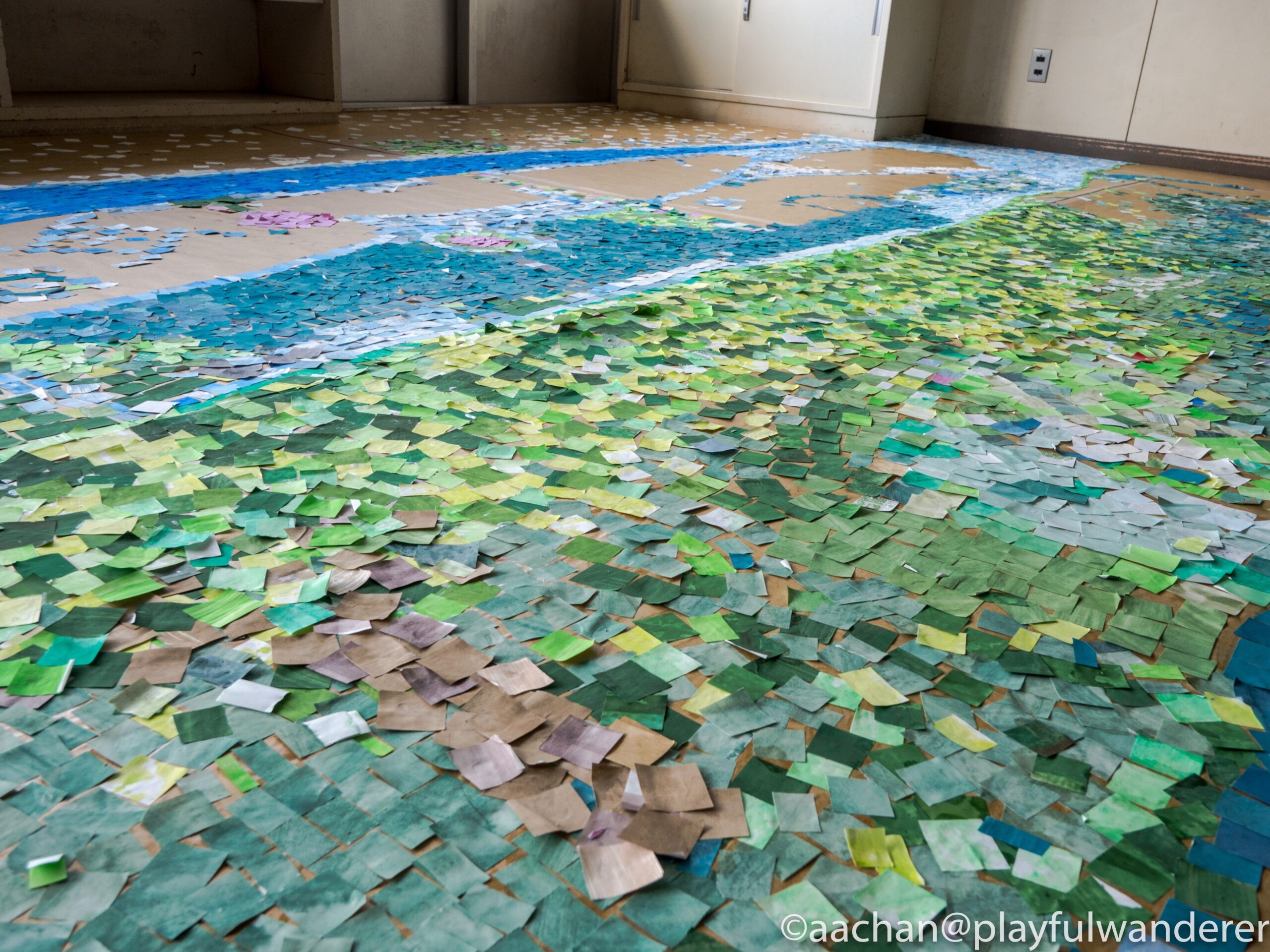 2Fの教室を複数使用しての公開ワークショップで、段ボールを貼った床や立体物に細かく切ってある様々な色の紙を貼りつけて情景を創っていく。必要なものは準備してあるので気軽に参加できますね。