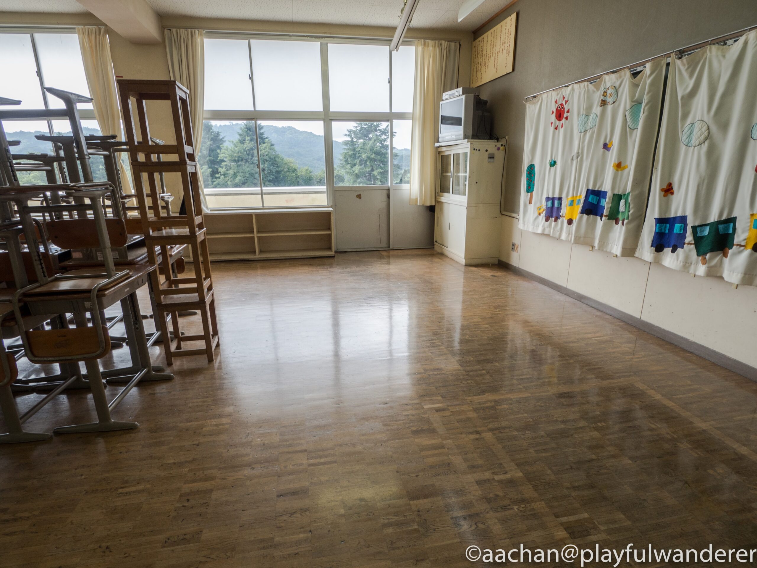 正反対なふたつをつなげるという思いで、空の教室にインドの子供たちの声が響き渡るという「音」の作品。