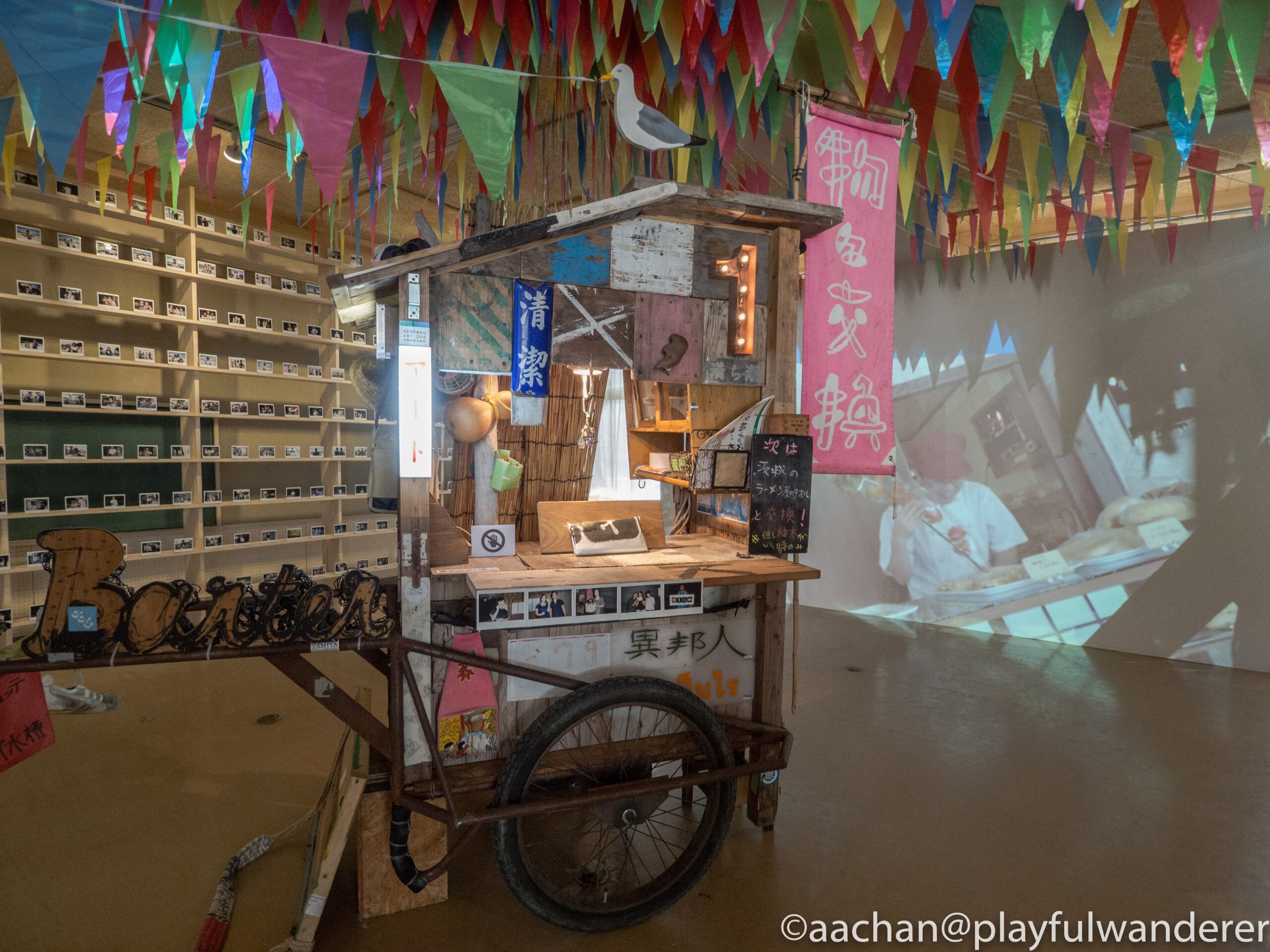 この屋台を引いて旅をしながら、出会った人々と物々交換をしていくプロジェクト。今までどんな人々と交流し、どういう交換をしてきたか、階段から写真がどどーっと並べられていました。