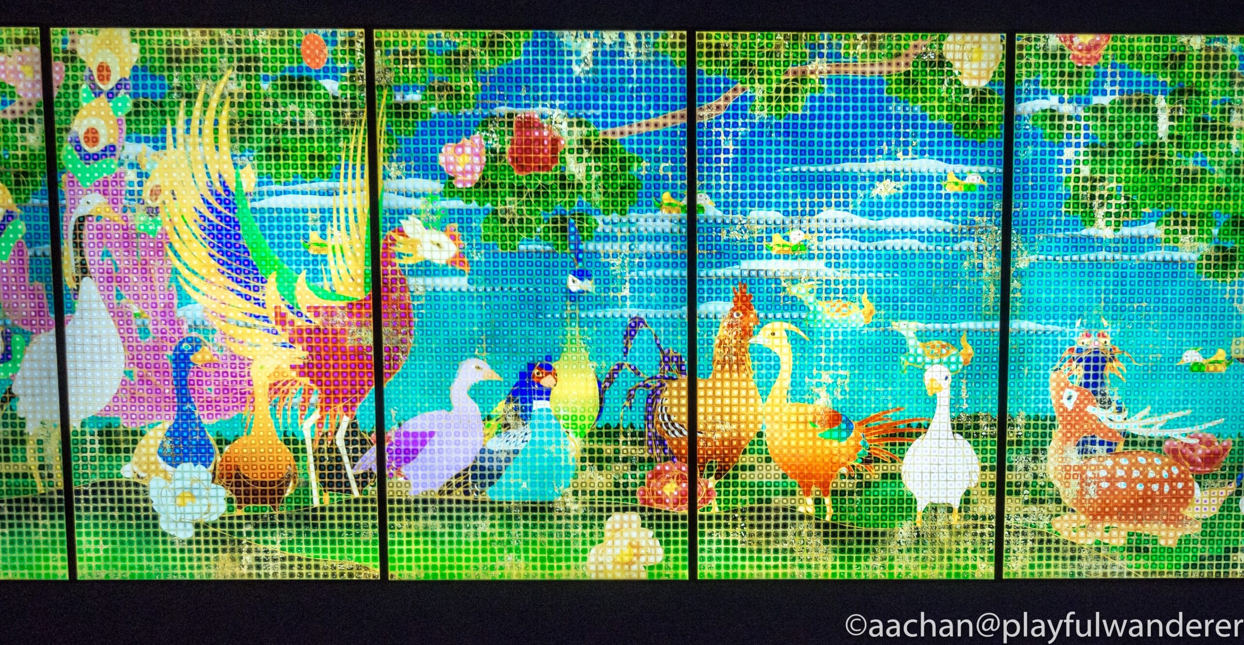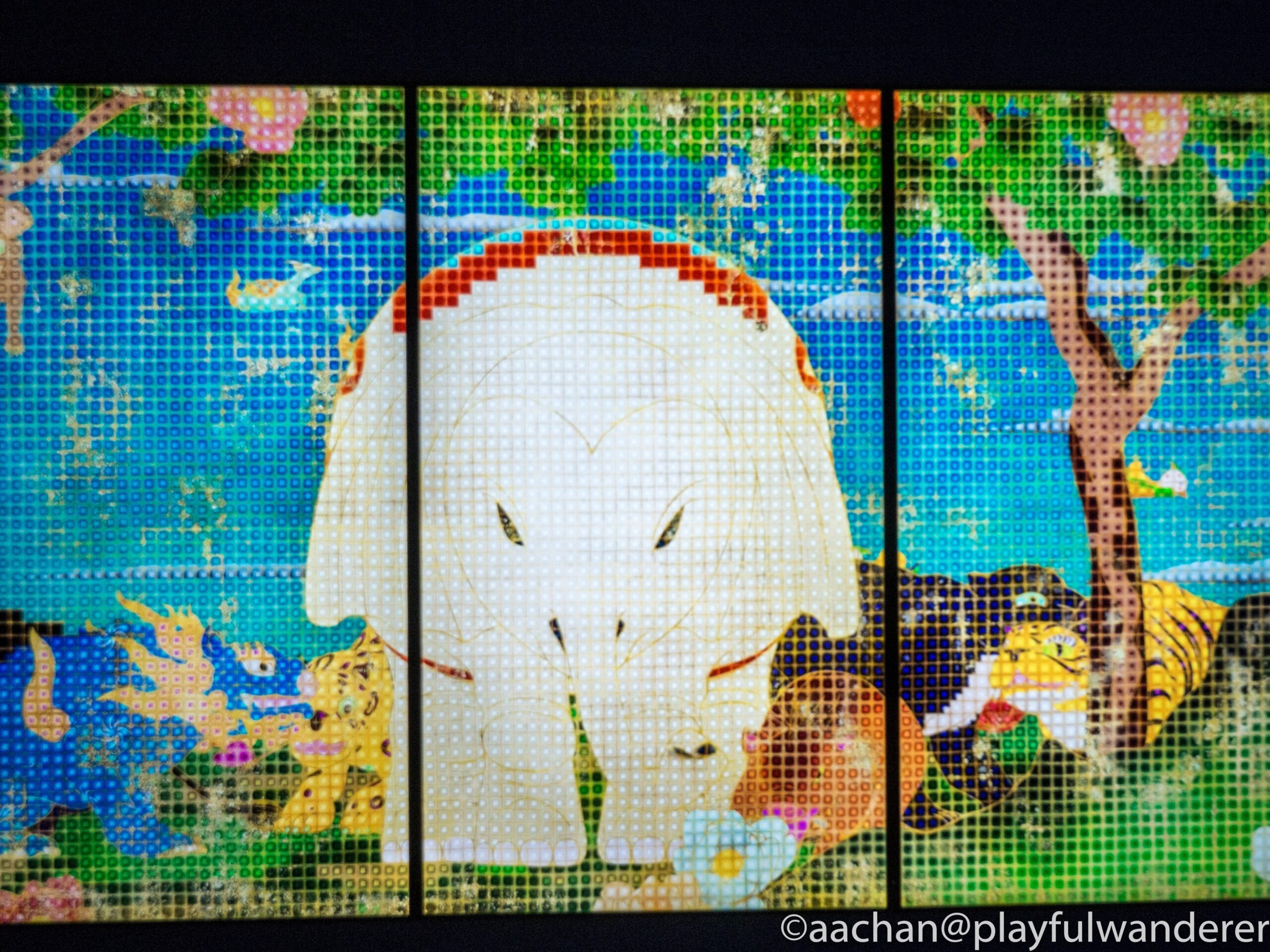 仕切られたドットの中にじわりとにじみ出てくるように彩色され、動物たちは色鮮やかに生き生きと動き、風景も四季を表現して変化していく。