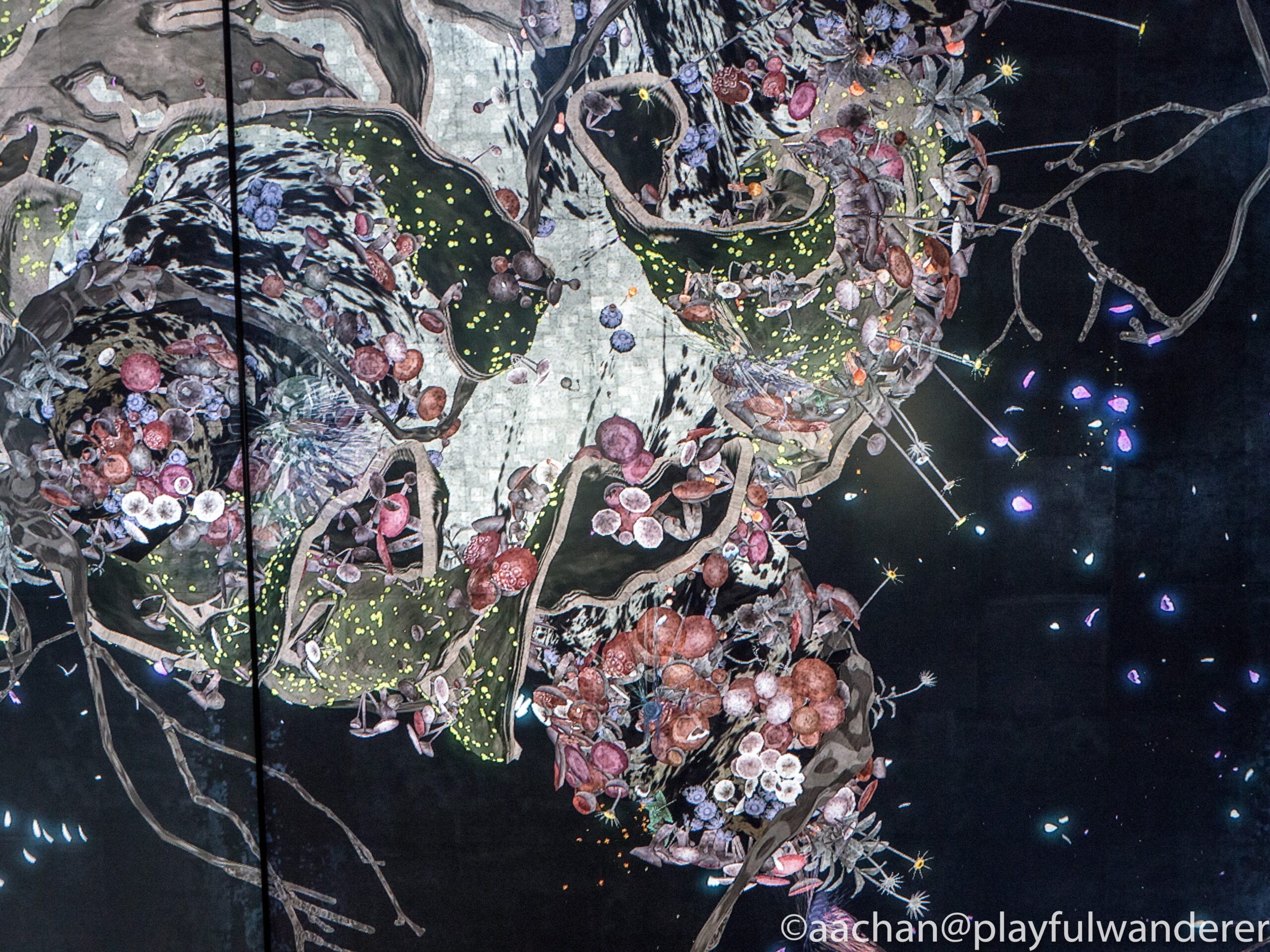 シビックセンターの天球劇場で見たのと同じように増殖する演算が使われており、うねり、花が咲き、飲み込まれていく。