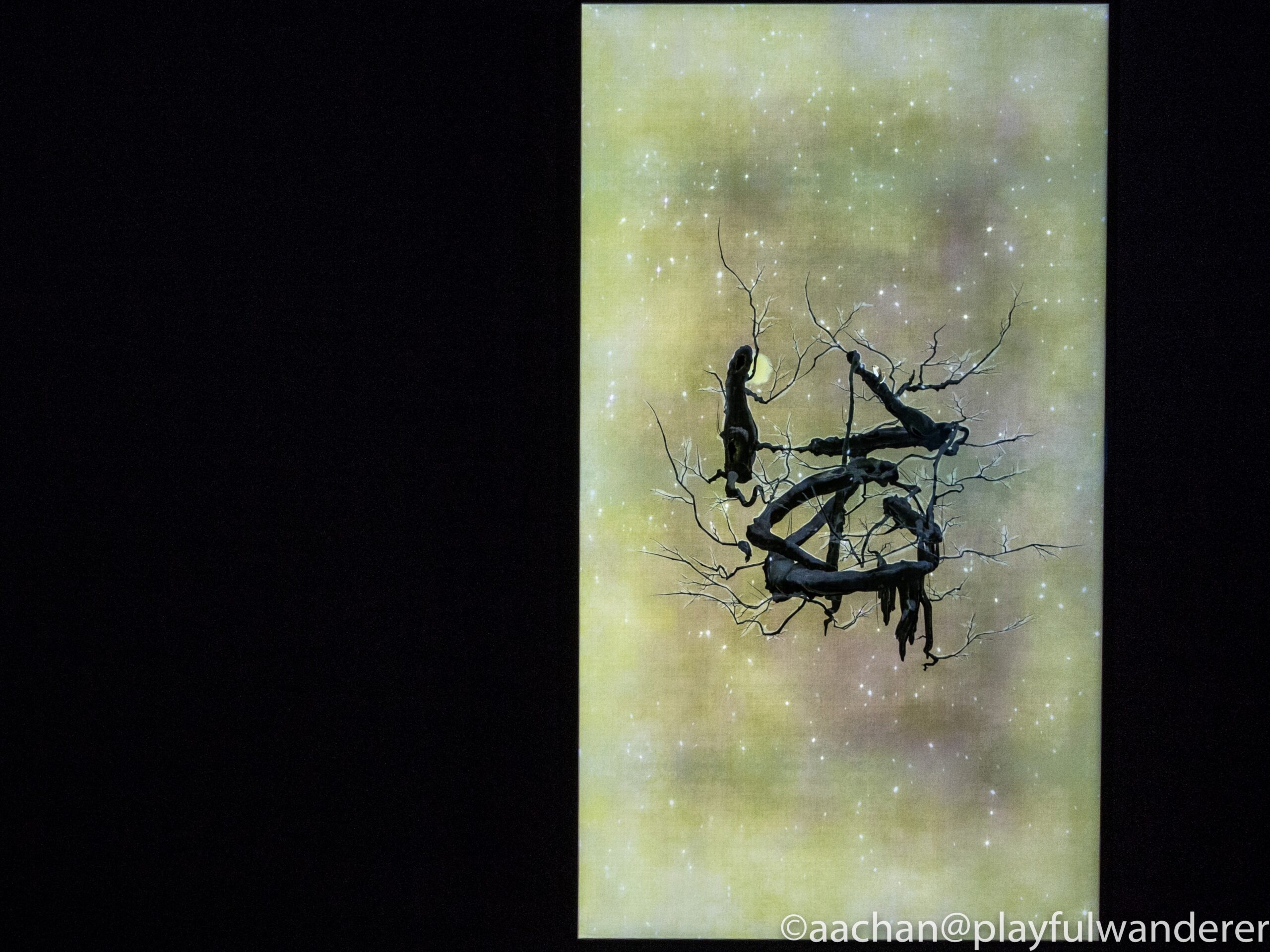 最初に墨で書かれた書が立体化していって枝となり、鳥が寄ってきてさえずり、雪が積もり、芽吹き、花が咲き、茂り、、、