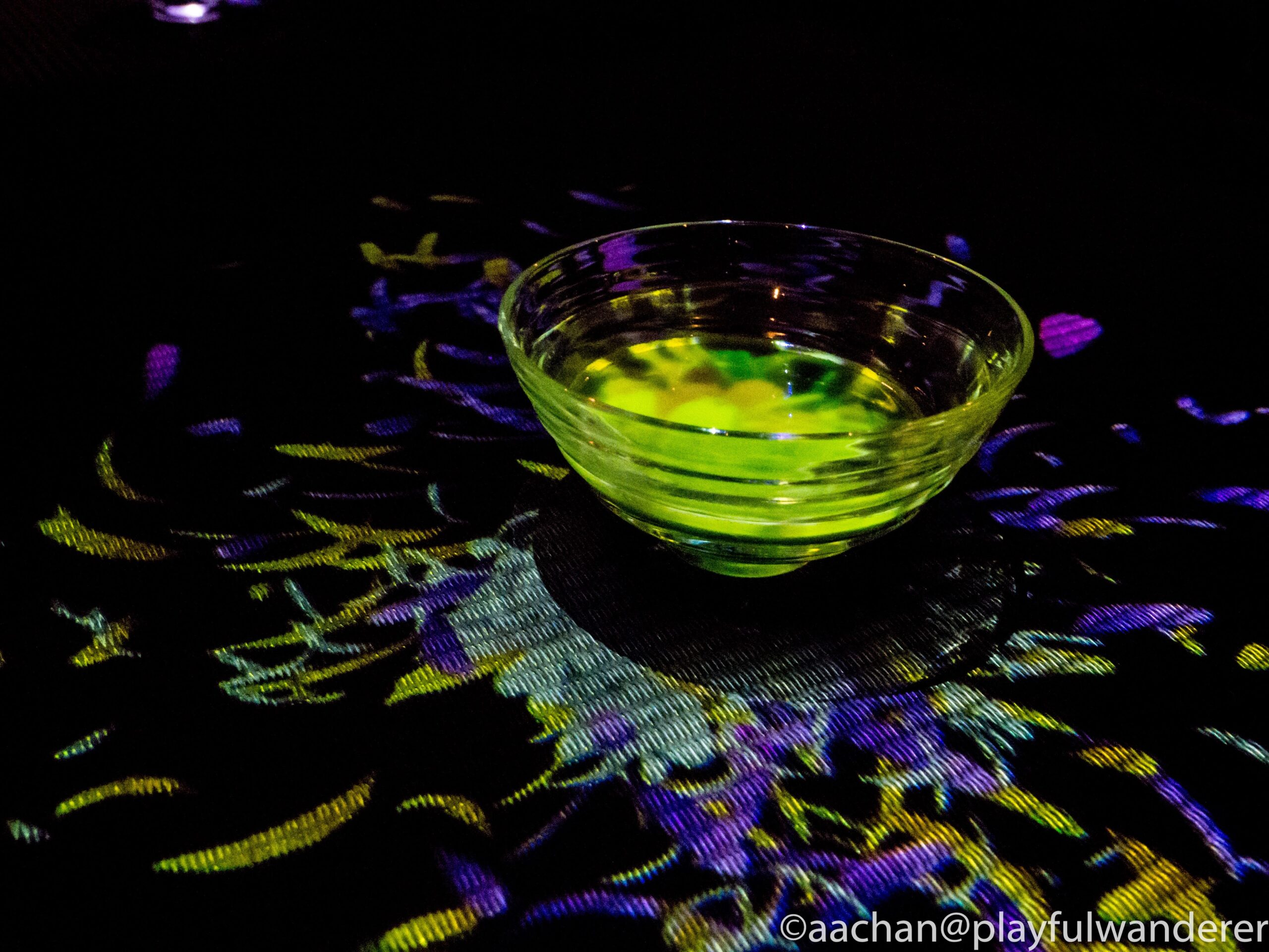 手に持ったスティックで墨文字を書くらしいが、ちょっと私の席は不調でどうやっても「一」か「〇」ぐらいしかまともに描けなかった(^^;)描いたところをじっと見ると黒い墨の中を鯉のようなものが泳ぎだすのが見えるだろう。