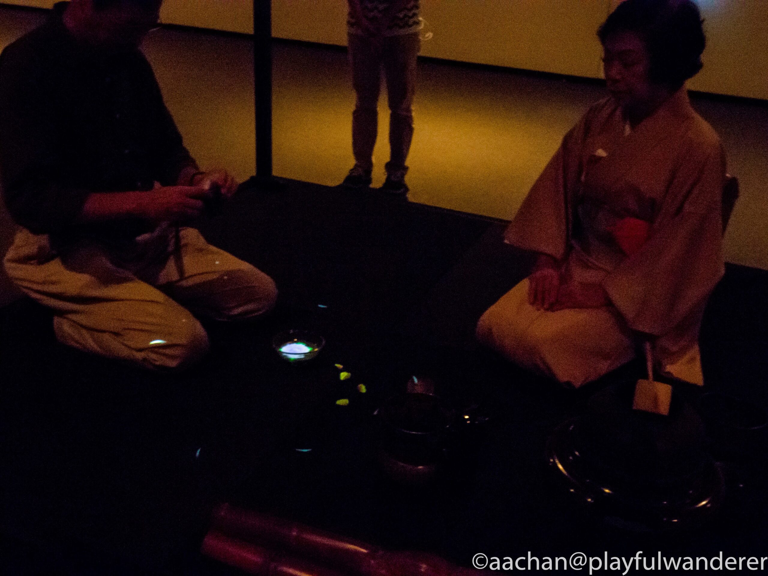 かなり暗い空間のなかで、おもてなし役の着物をきたベテランお姉さまがお招き下さるので、靴をぬいで壁のない座敷にあがります。(同時に2名まで可のようだ)