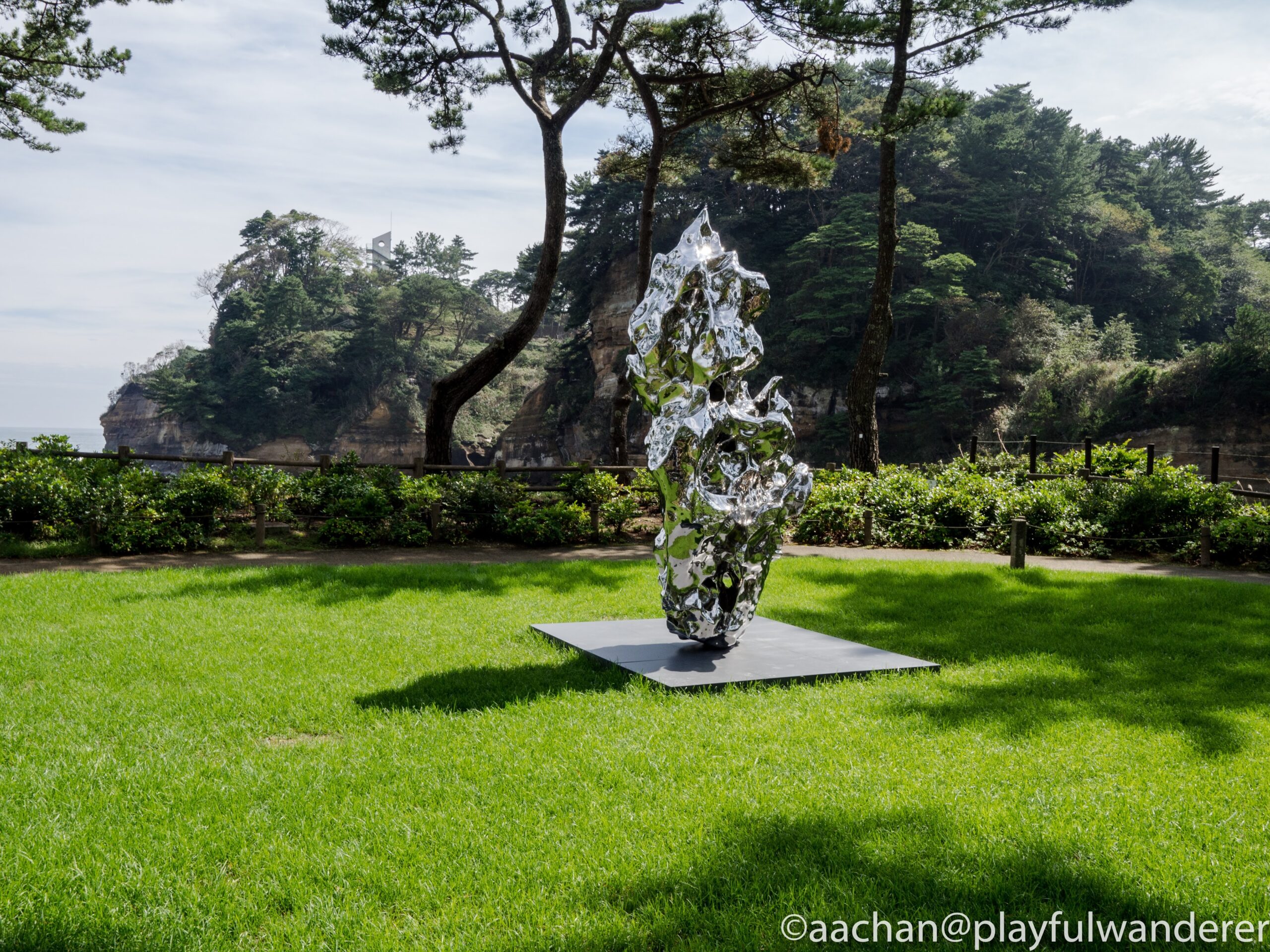 自然の奇岩の景観をバックに、旧天心邸前の芝生広場に奇岩っぽい彫刻がたつ。