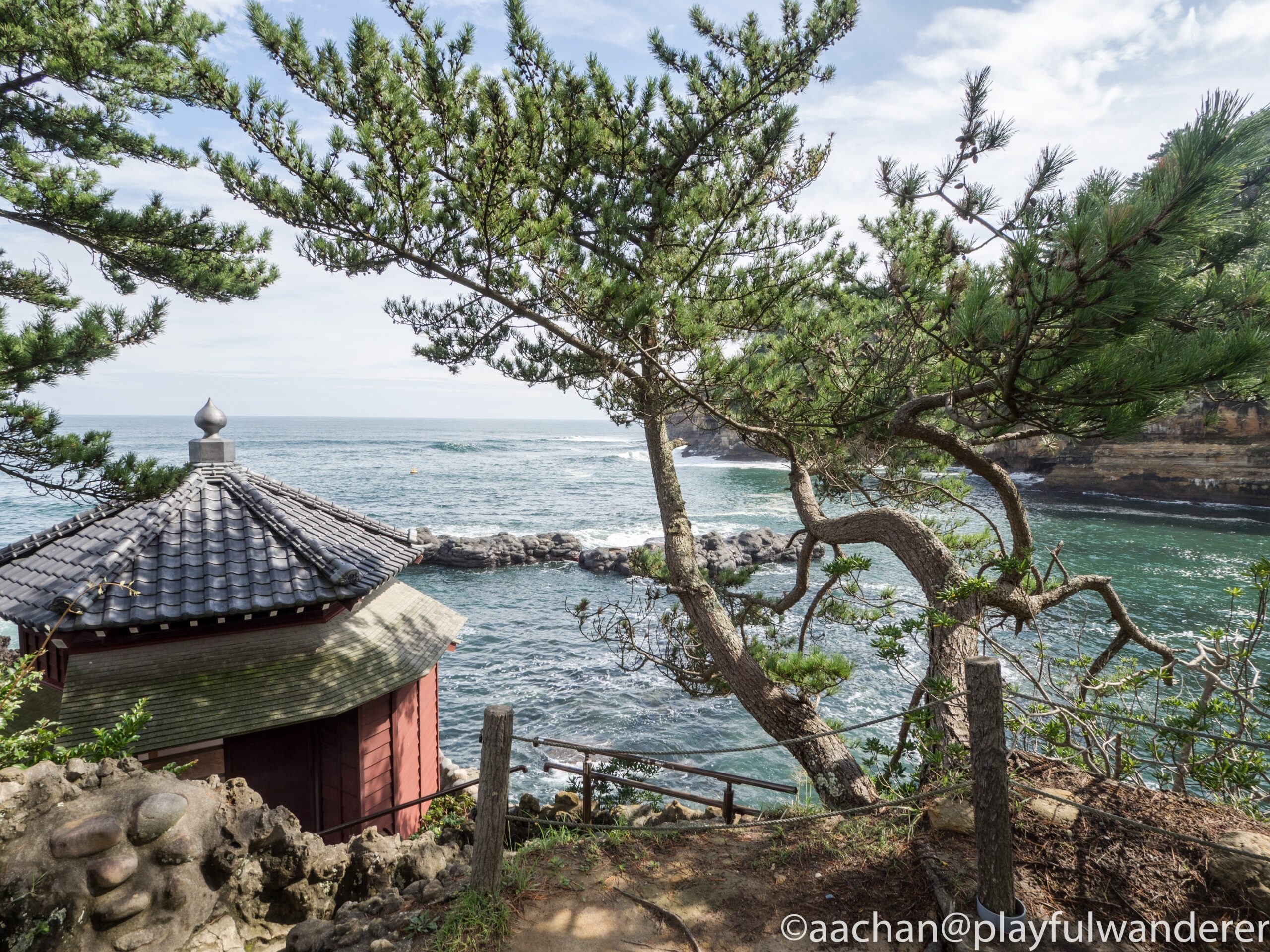 松島ほどではないが、地層むき出しの岸壁と松と広がる海原の景勝地。