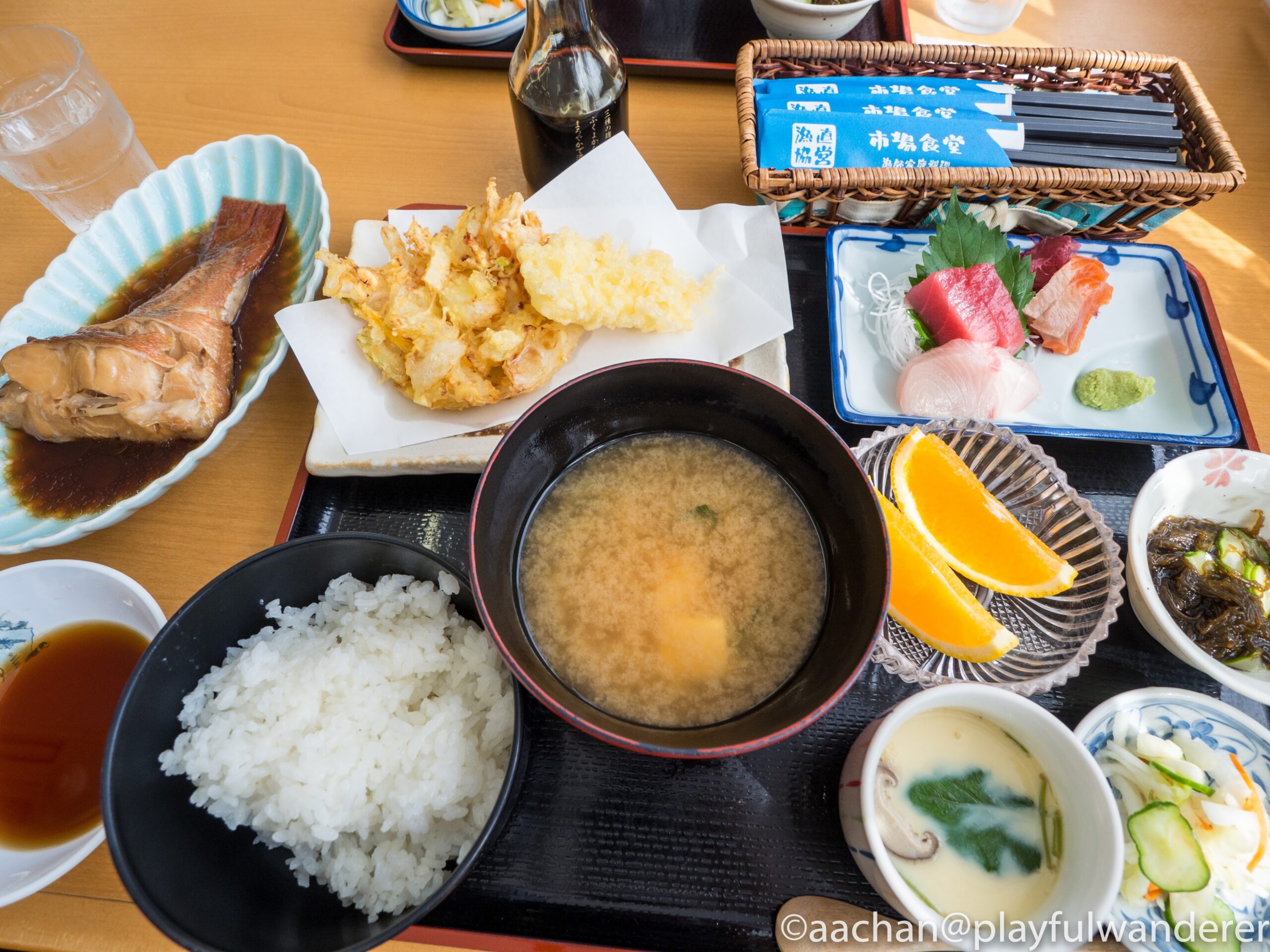 おまかせ定食は、煮魚、刺身、天ぷら、もずく、茶碗蒸しなどがついてなかなか豪華。