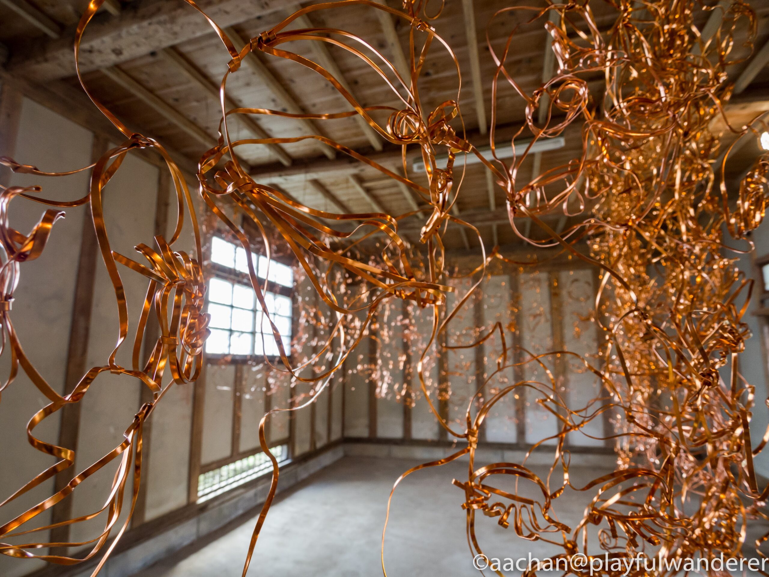 門わきの農具小屋の中一面にぐねぐねうねったワイヤーがつるされていました。どうやらひとつひとつ人間の顔を表しているようです。
