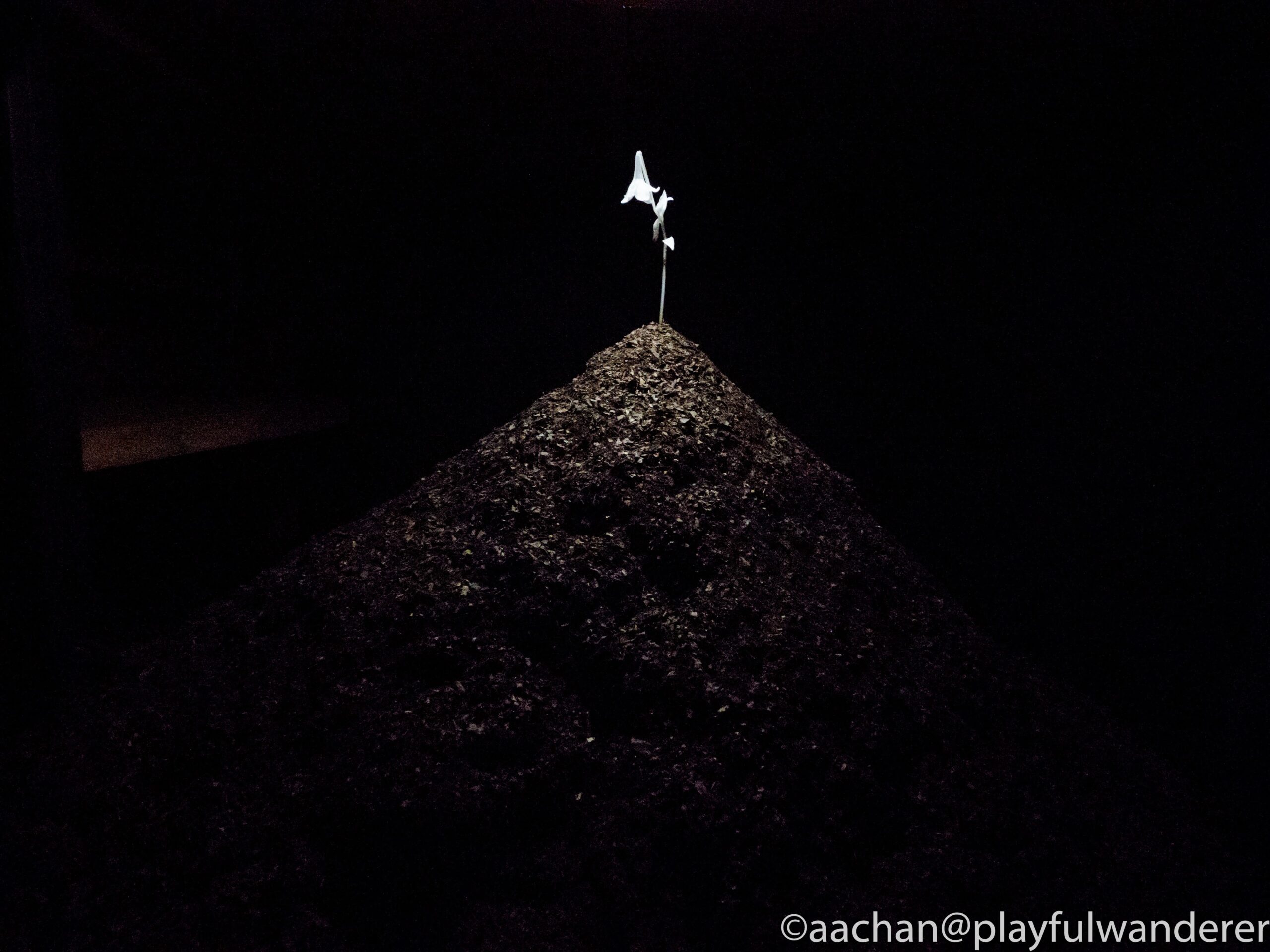 真っ暗な物置のような室内に土砂がつまれ、一輪の人工的な花が浮かび上がっている