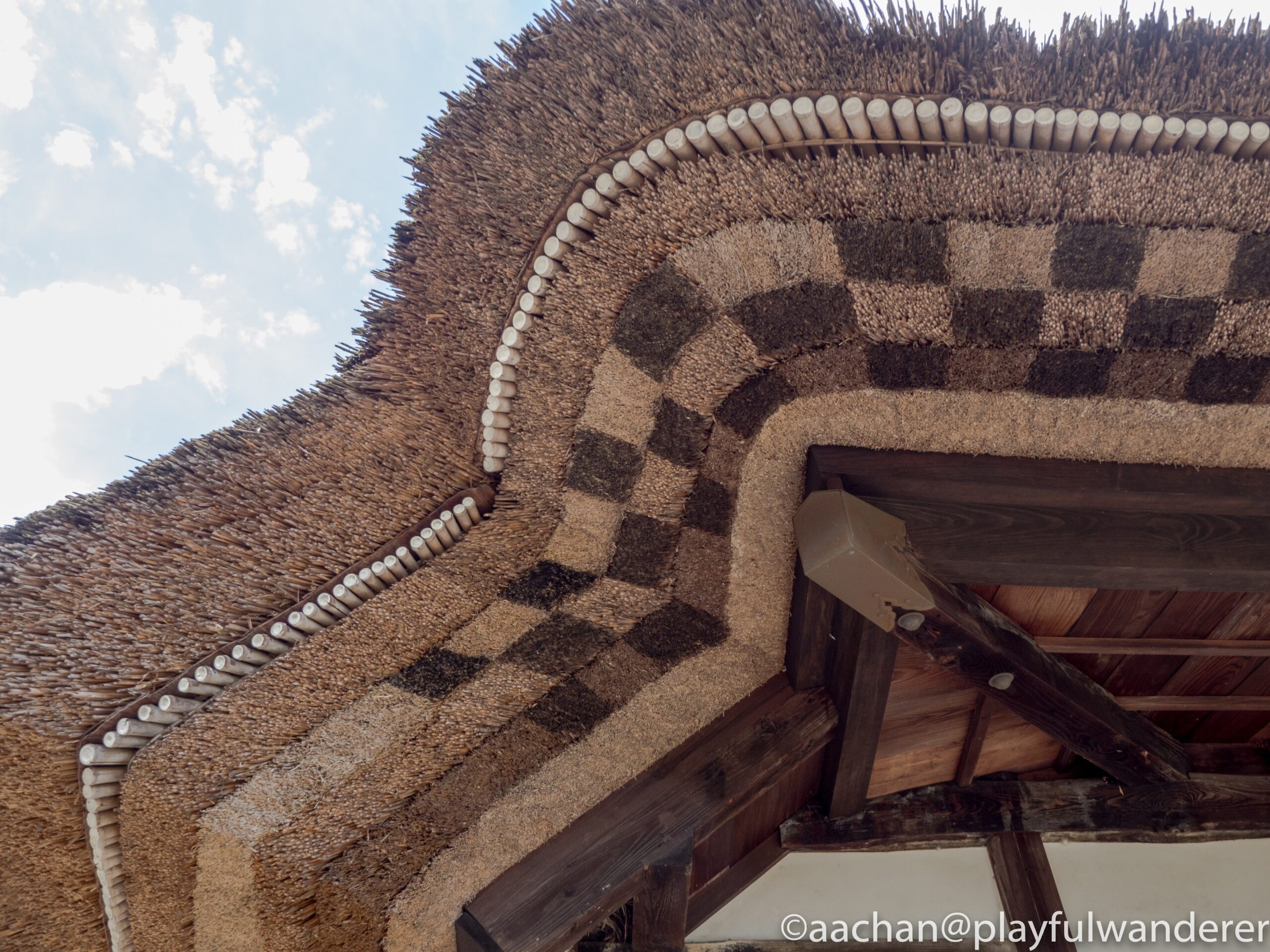 藁ぶきの屋根のひさしがみたこともないおしゃれなつくりになっていました。