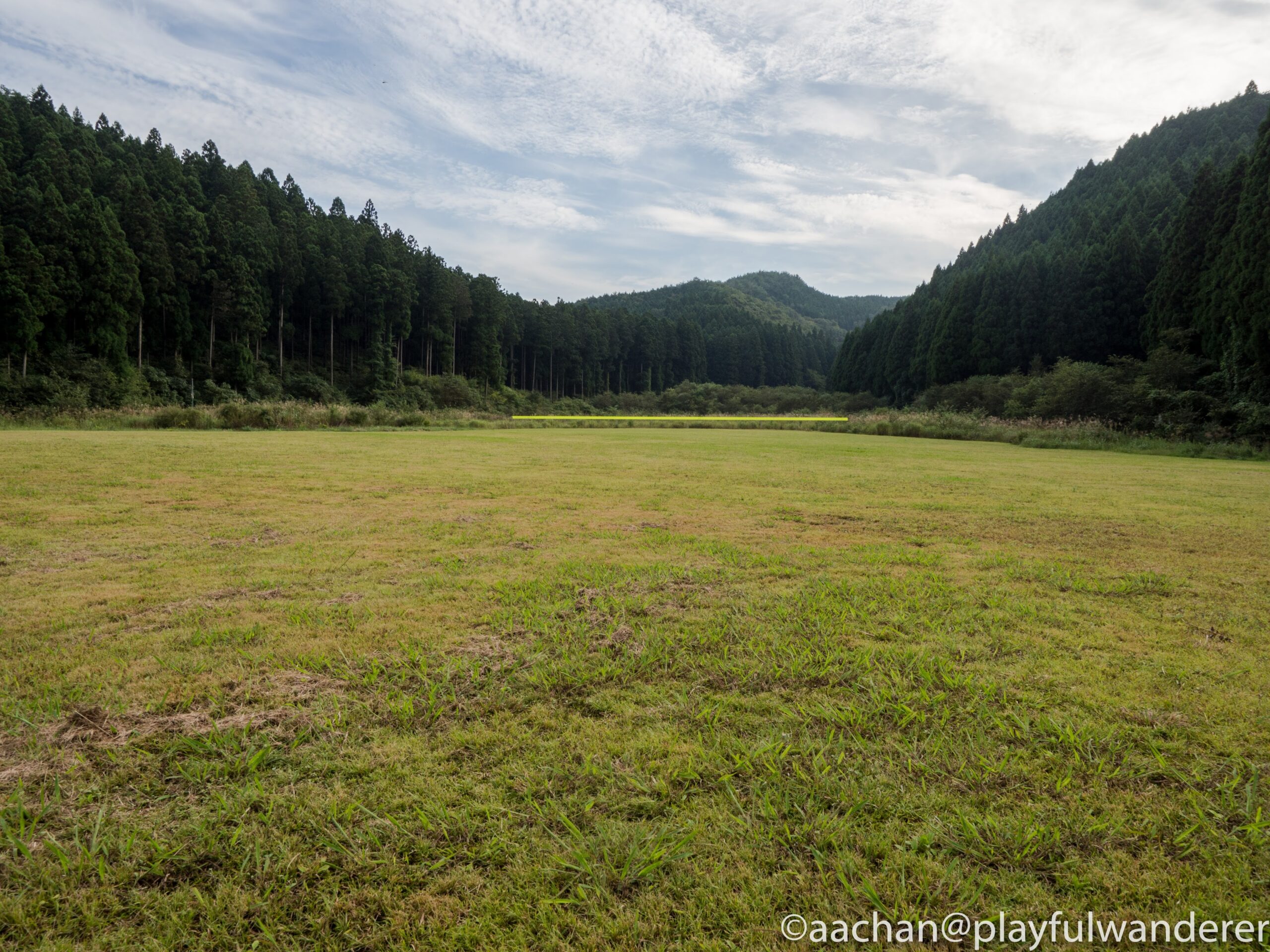 広がる雑木林と山をバックに、何かを仕切るようにひかれた一本の線。