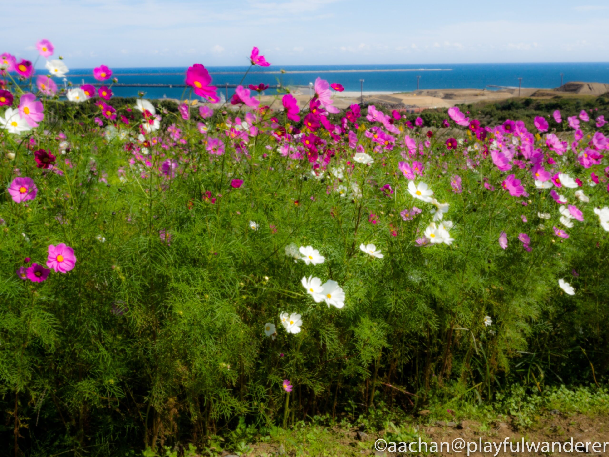 頂上付近にもコスモスが植えられていて、海をバックにそよいでました。