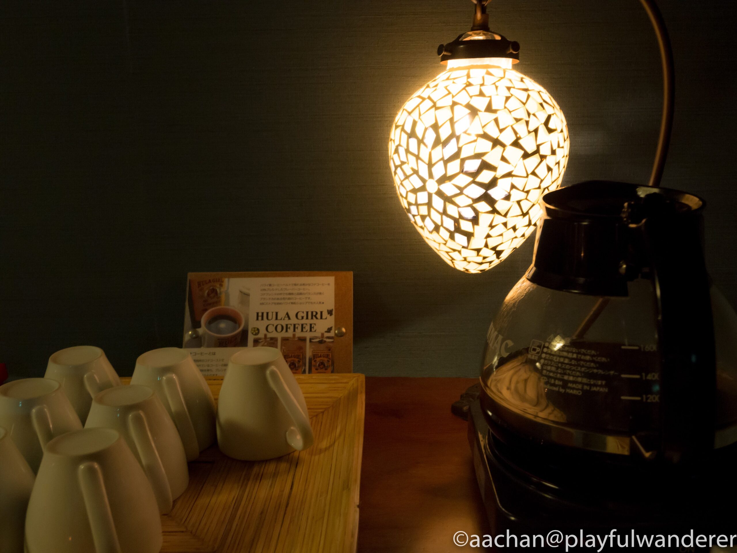すぐ近くにはセルフサービスのコーヒーコーナーもあり、キャラメルのような香りのハワイコナコーヒーがありました。