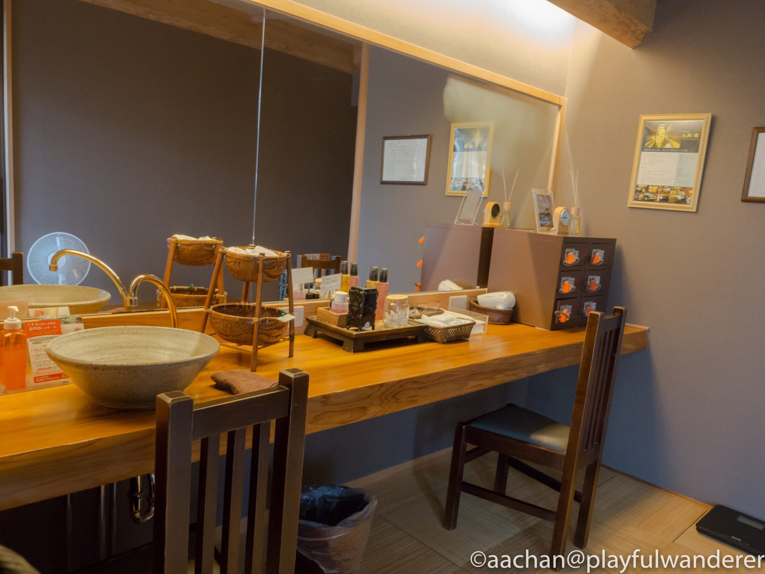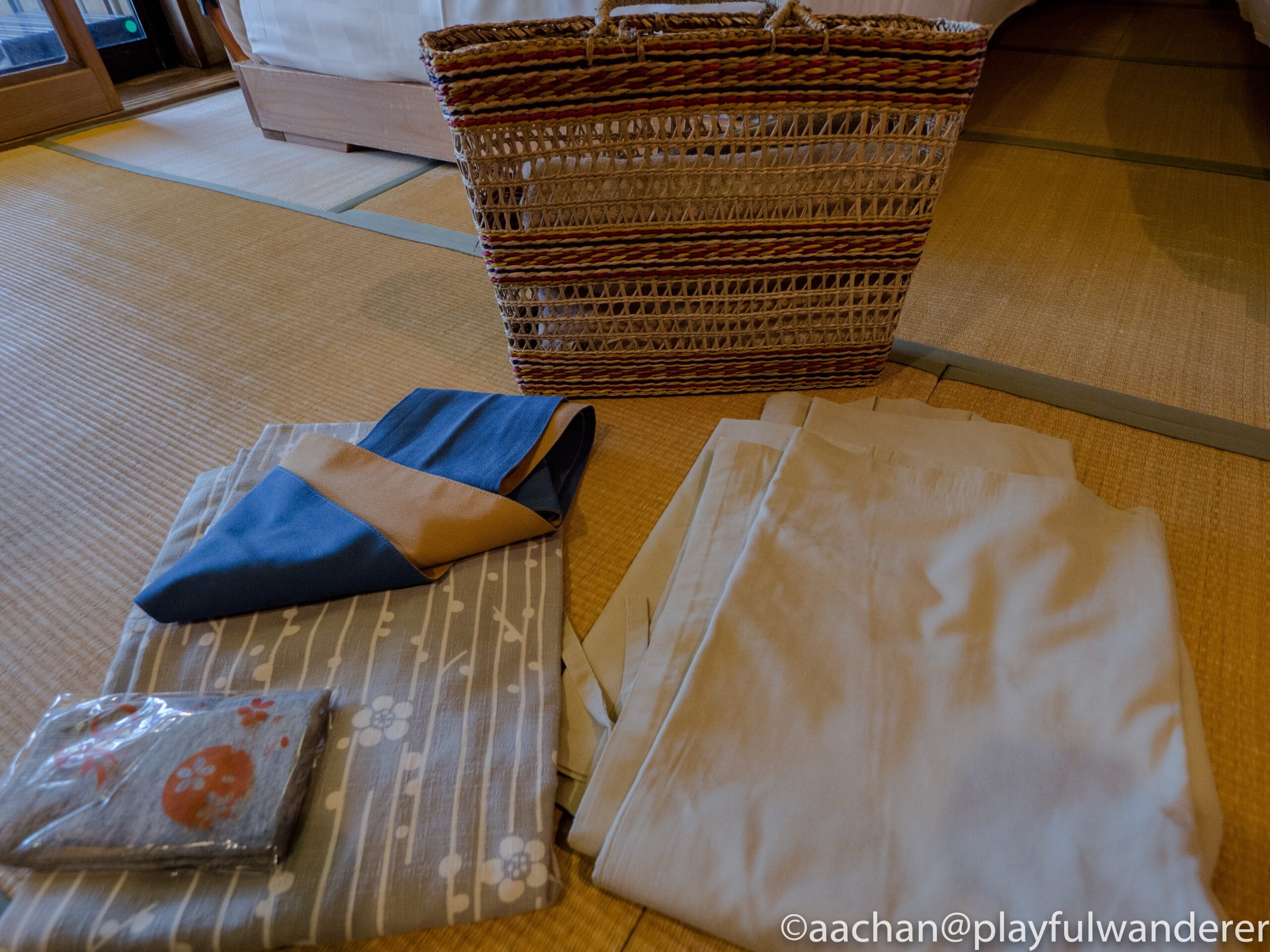 お部屋には、浴衣と丹前のセット以外にも、作務衣のような部屋着もあり、こちらの方が楽なせいか、宿泊者ほぼそっちを着てました(笑)