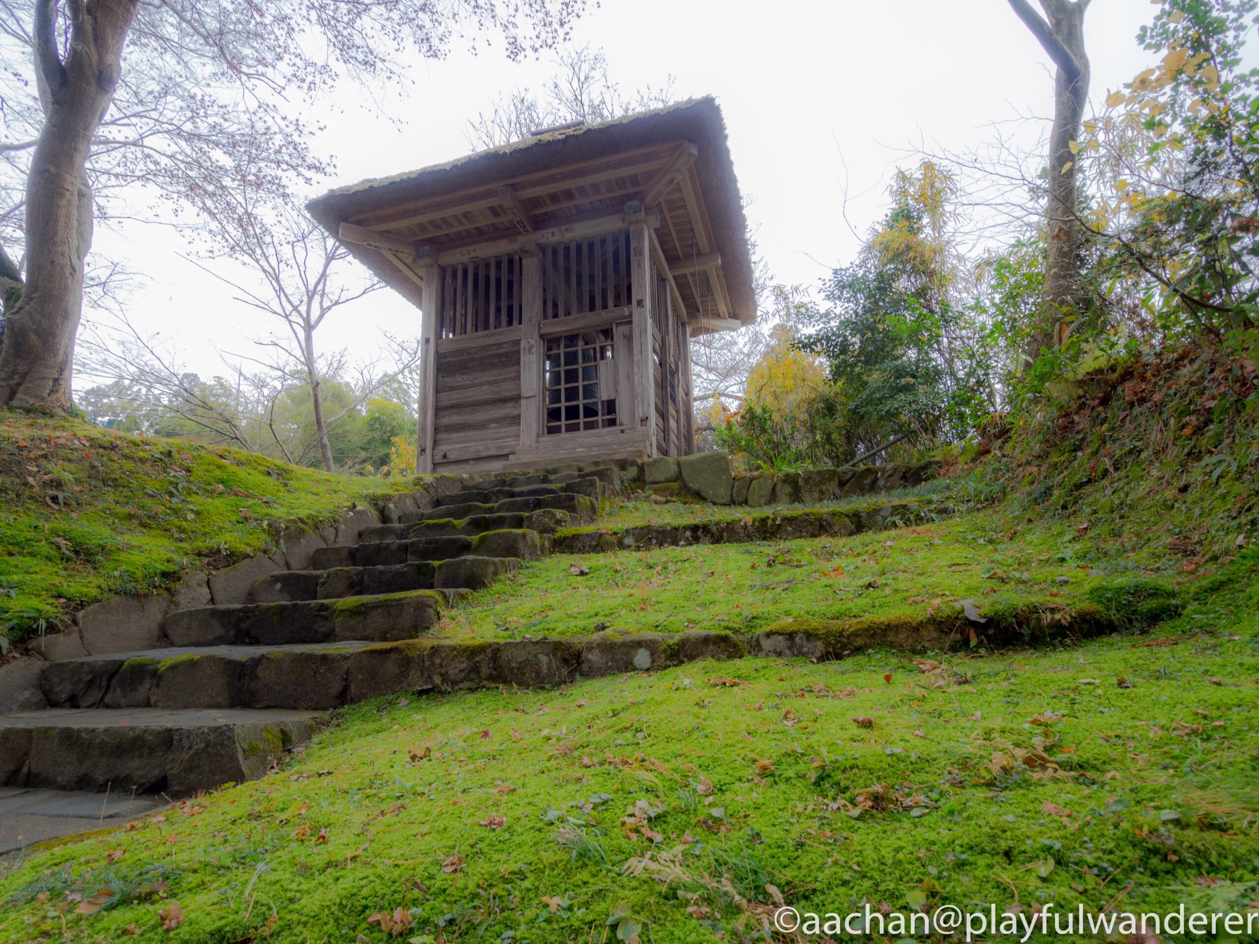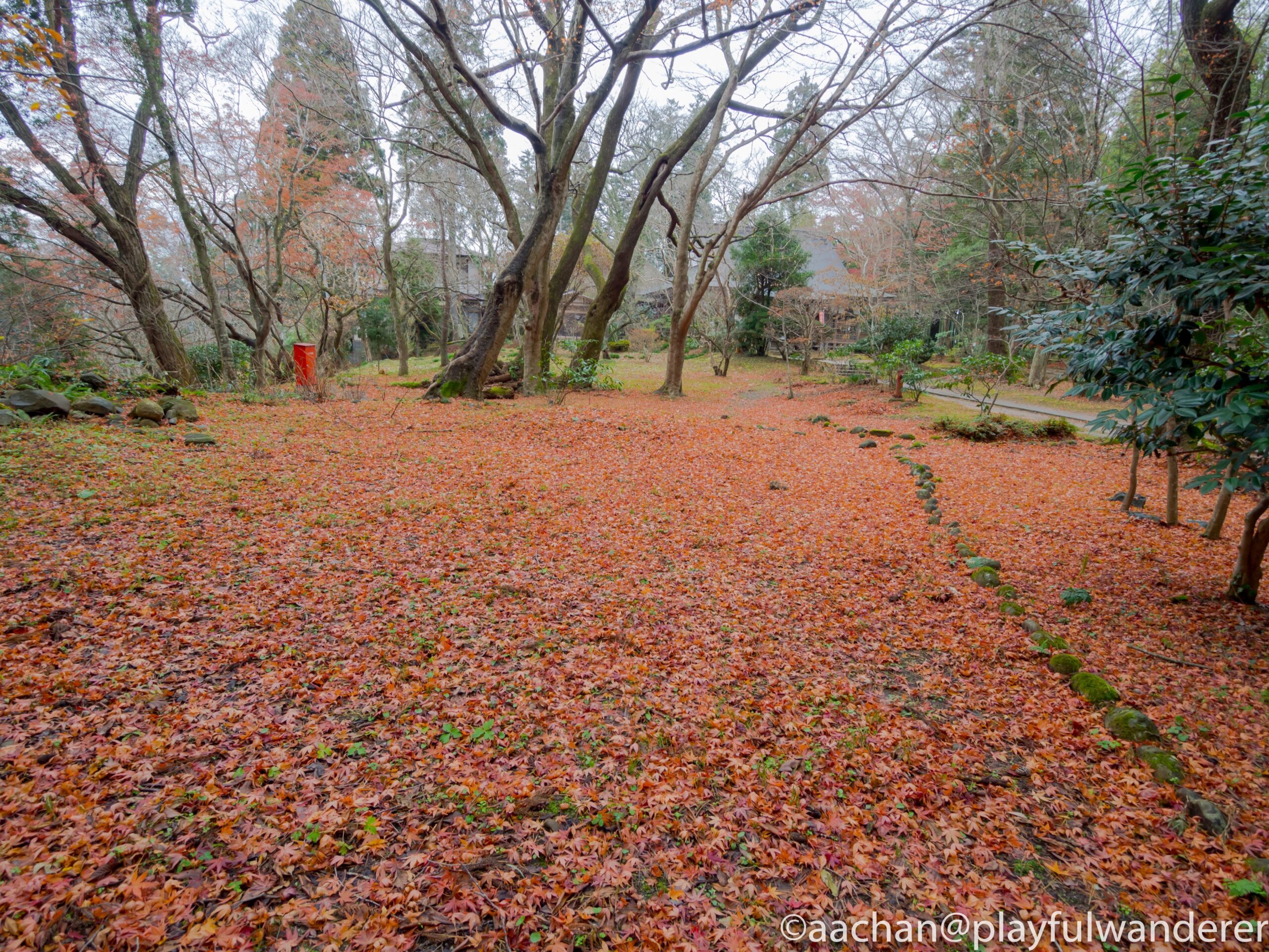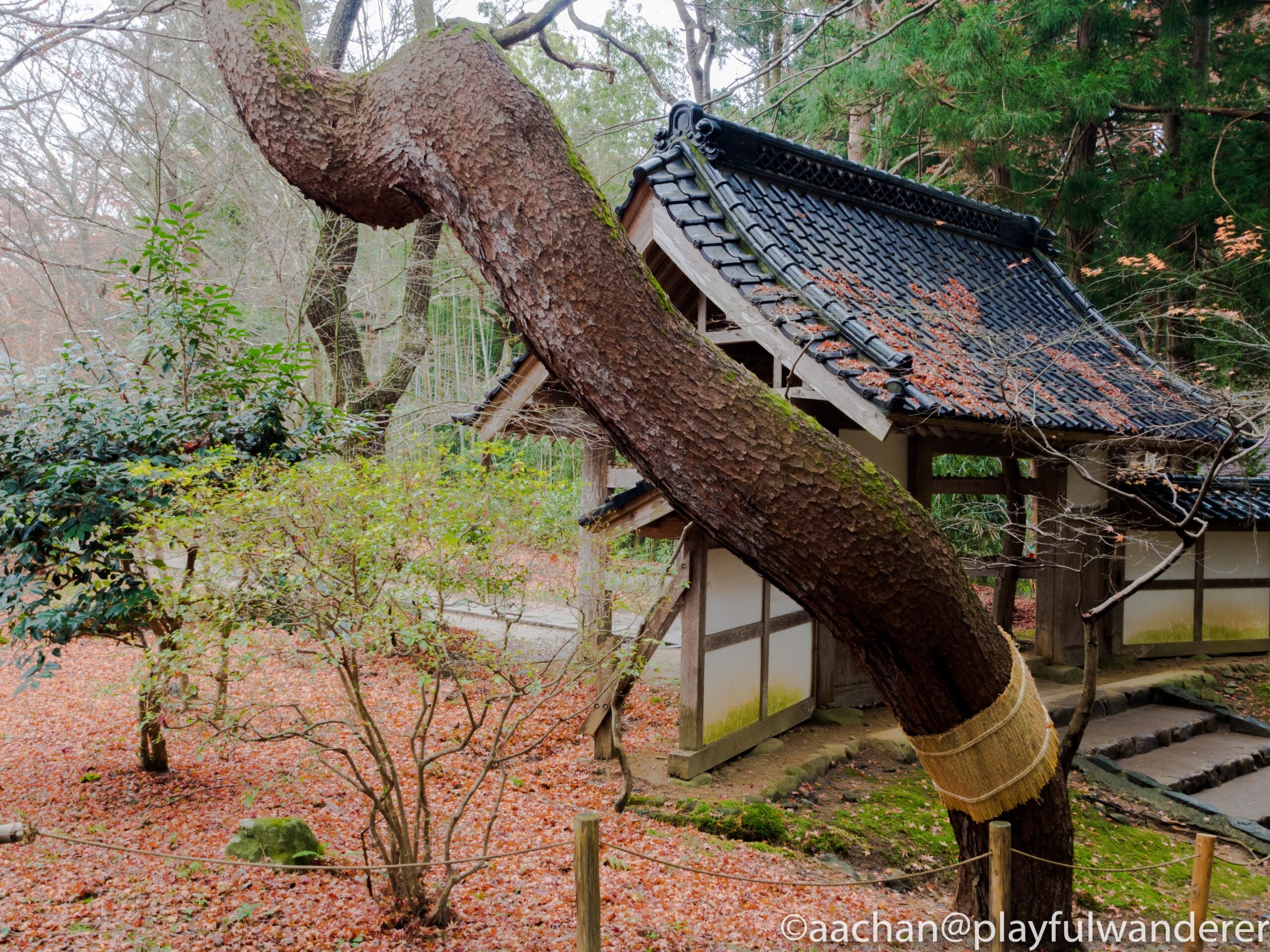 幹の茶と瓦の青と常緑樹の緑と苔の黄緑と落ち葉が絶妙な色のハーモニー。