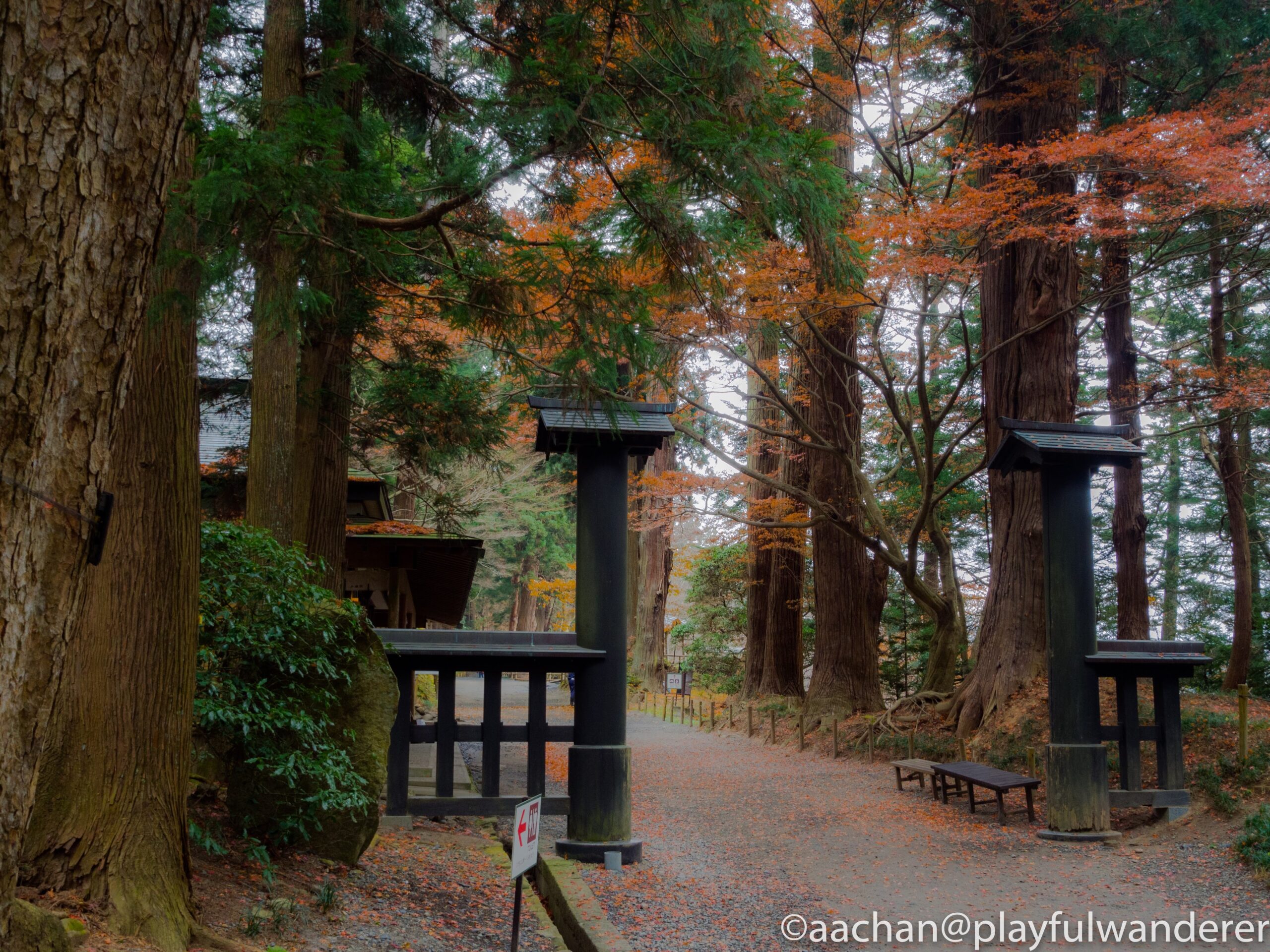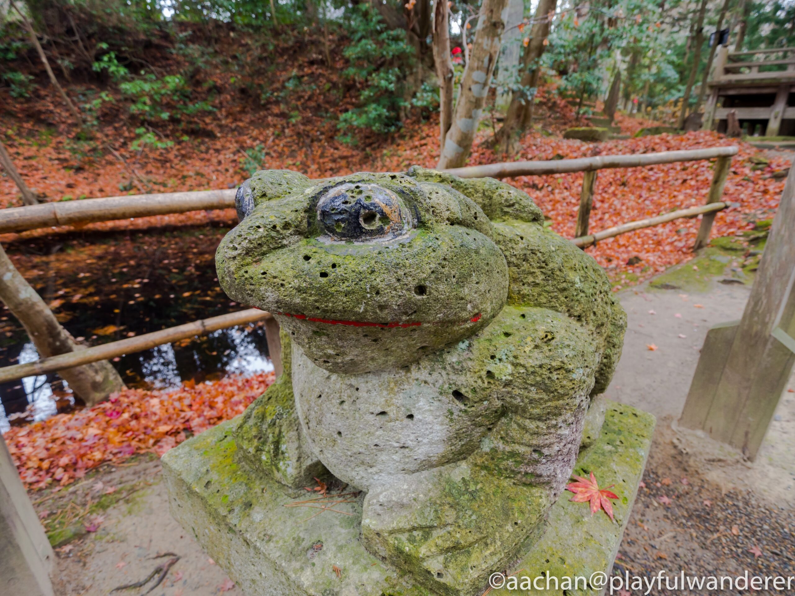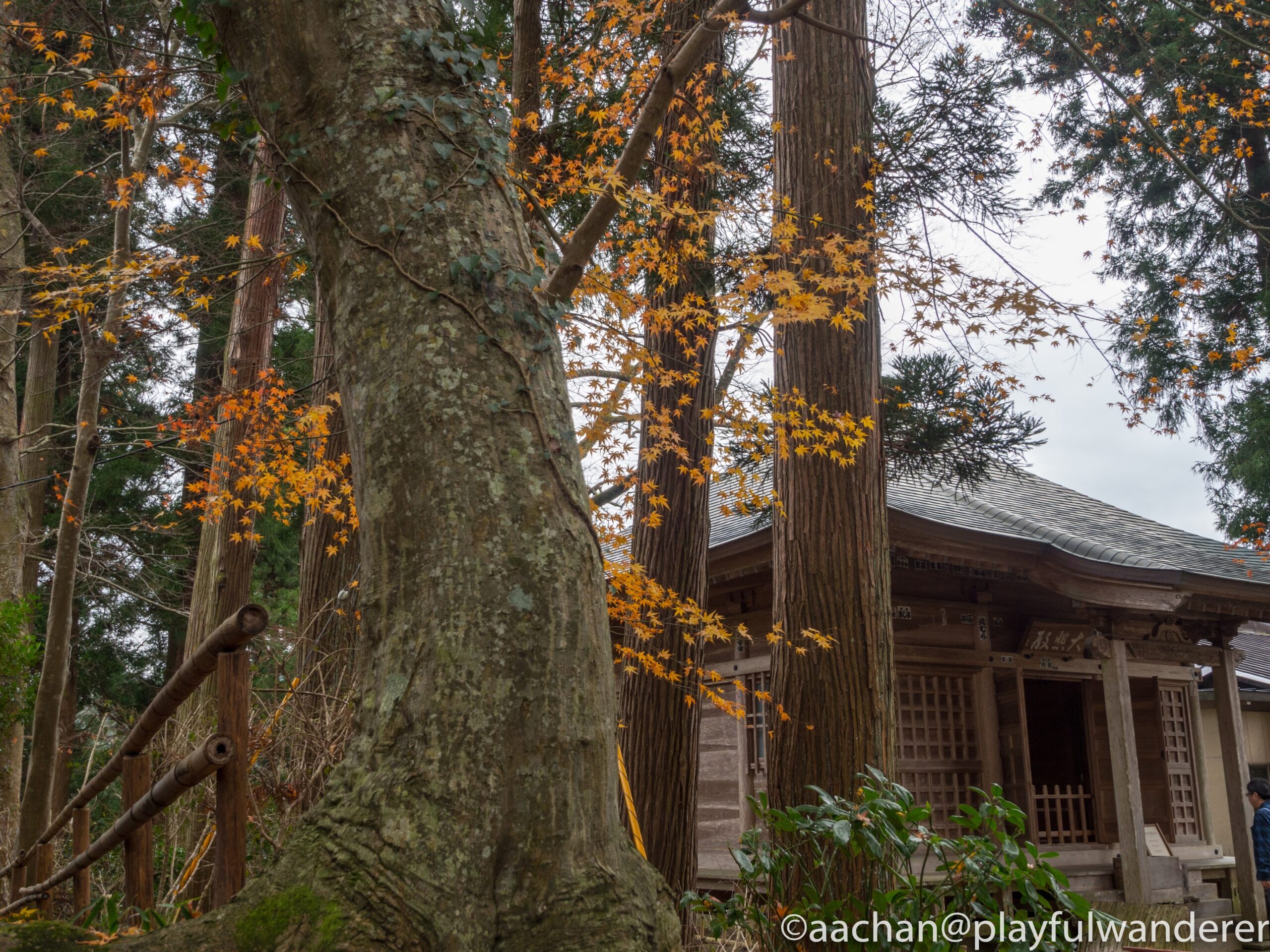 幹の茶と瓦の青と常緑樹の緑と苔の黄緑と落ち葉が絶妙な色のハーモニー。
