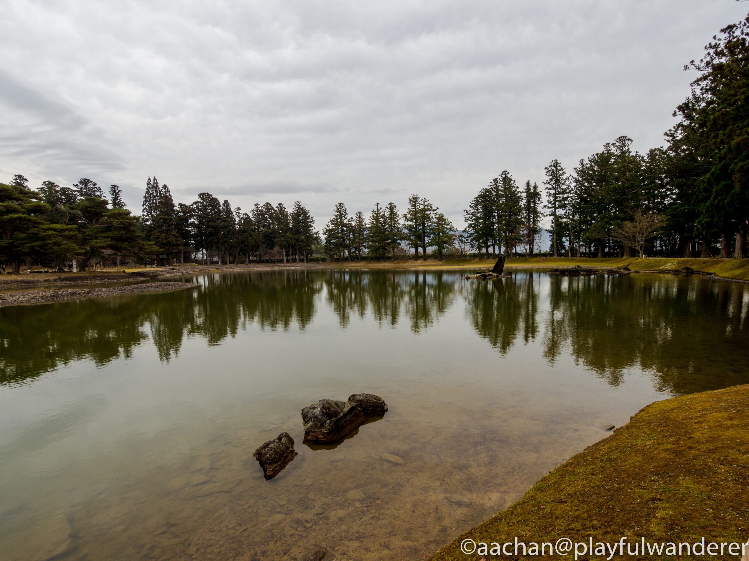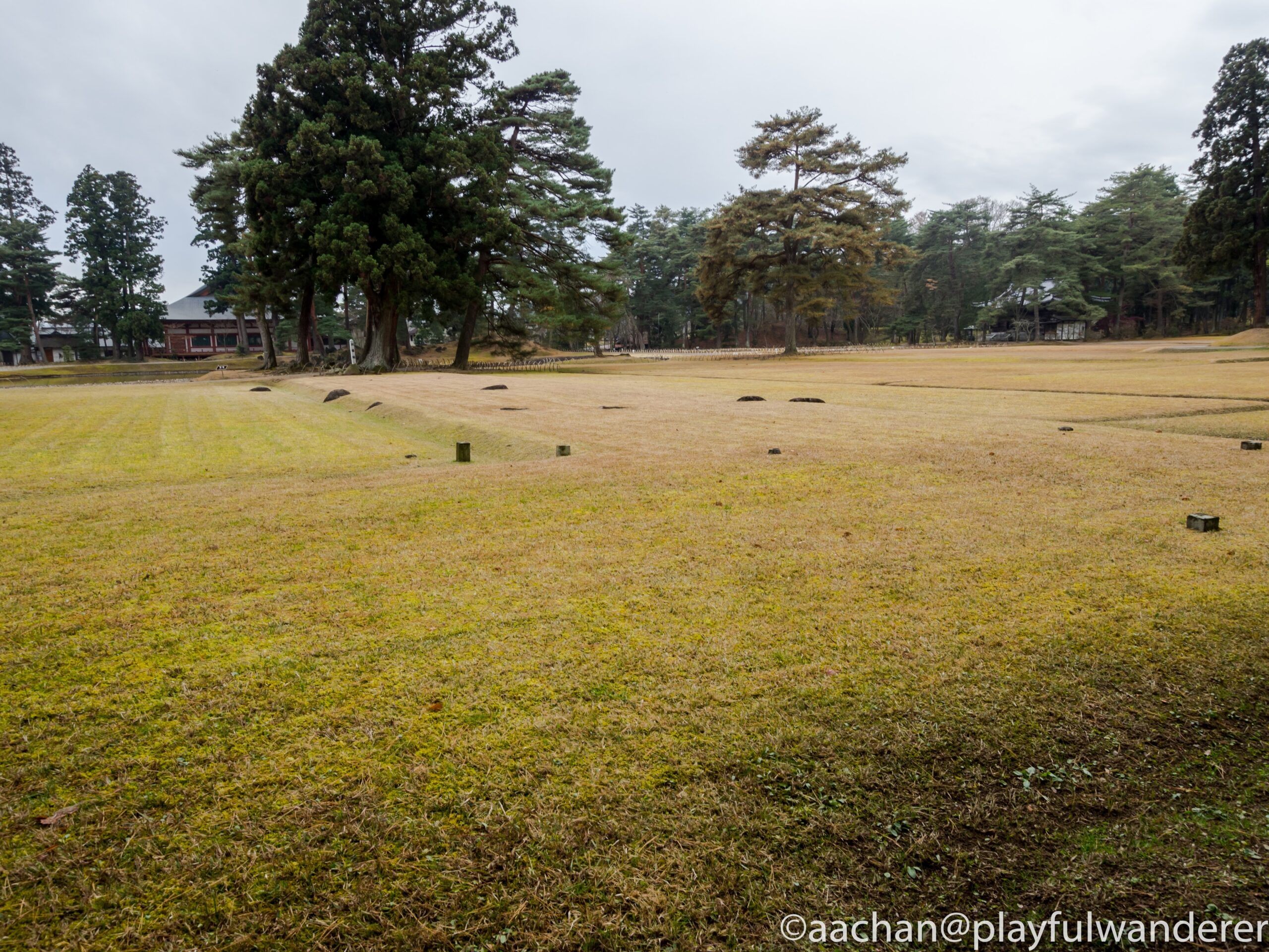 復元図をみると、各伽藍は先日藤原の郷で見た政庁のような形になっており、この芝生広場は貼りだした両翼の回廊に囲まれた広場のようになってるところに当たる。