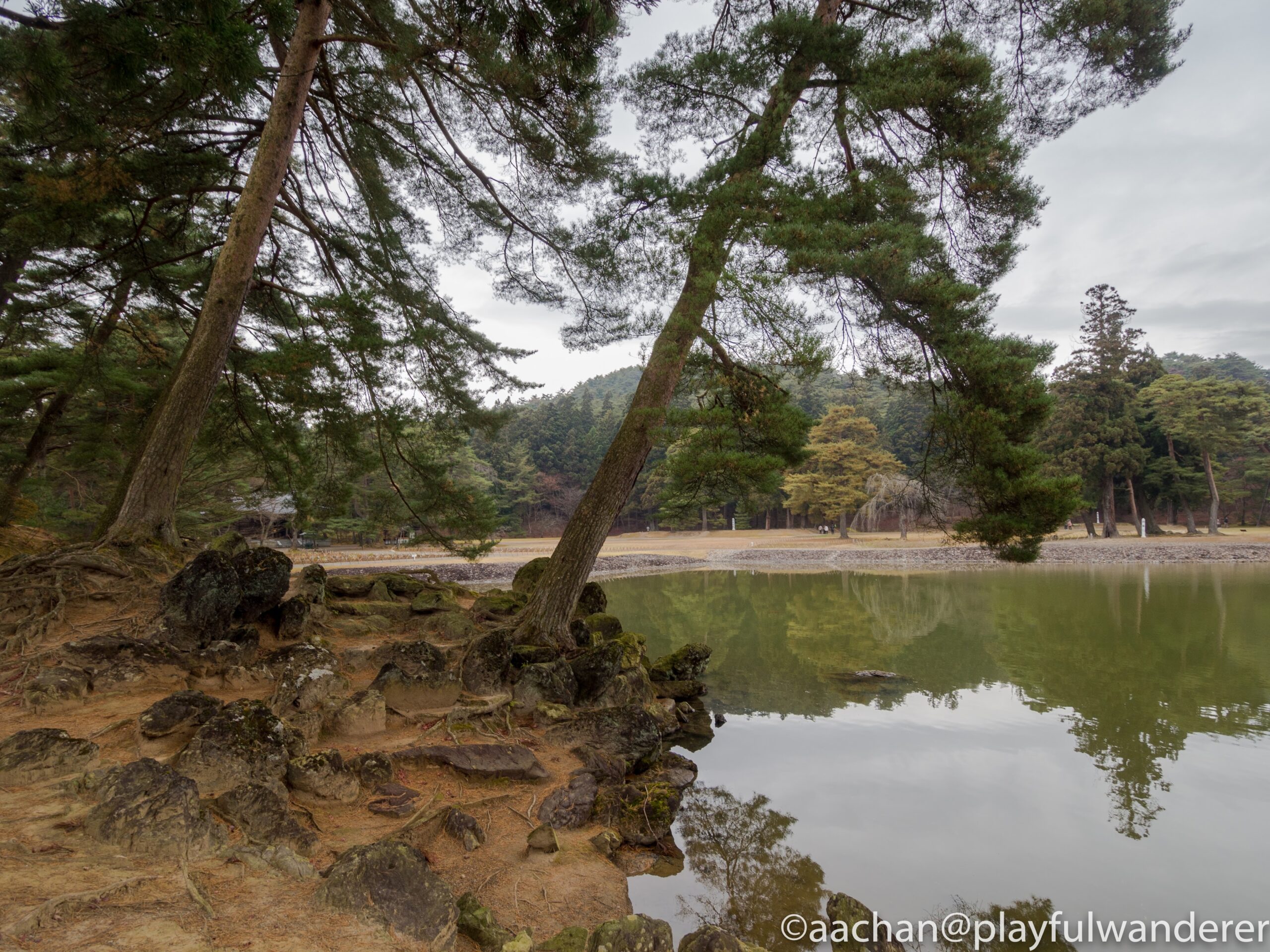 現在鐘楼のある位置と違って、昔はこの水際まで回廊がせり出していて、ここに鐘楼があったらしい。鐘の音が水面を伝っていく感じかな。